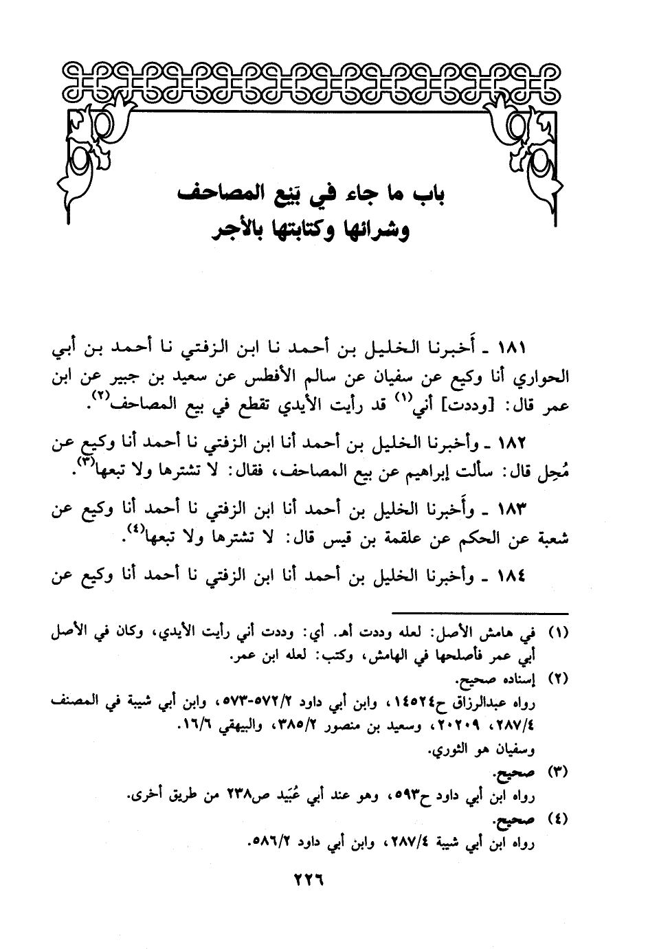 181- أخبرنا الخليل بن أحمد، حَدَّثَنا ابن الزفتي، حَدَّثَنا أحمد بن أبي الحواري، أخْبَرَنا وكيع عن سفيان عن سالم الأفطس عن سعيد بن جبير عن ابن عمر قال: وددت أني قد رأيت الأيدي تقطع في بيع المصاحف.