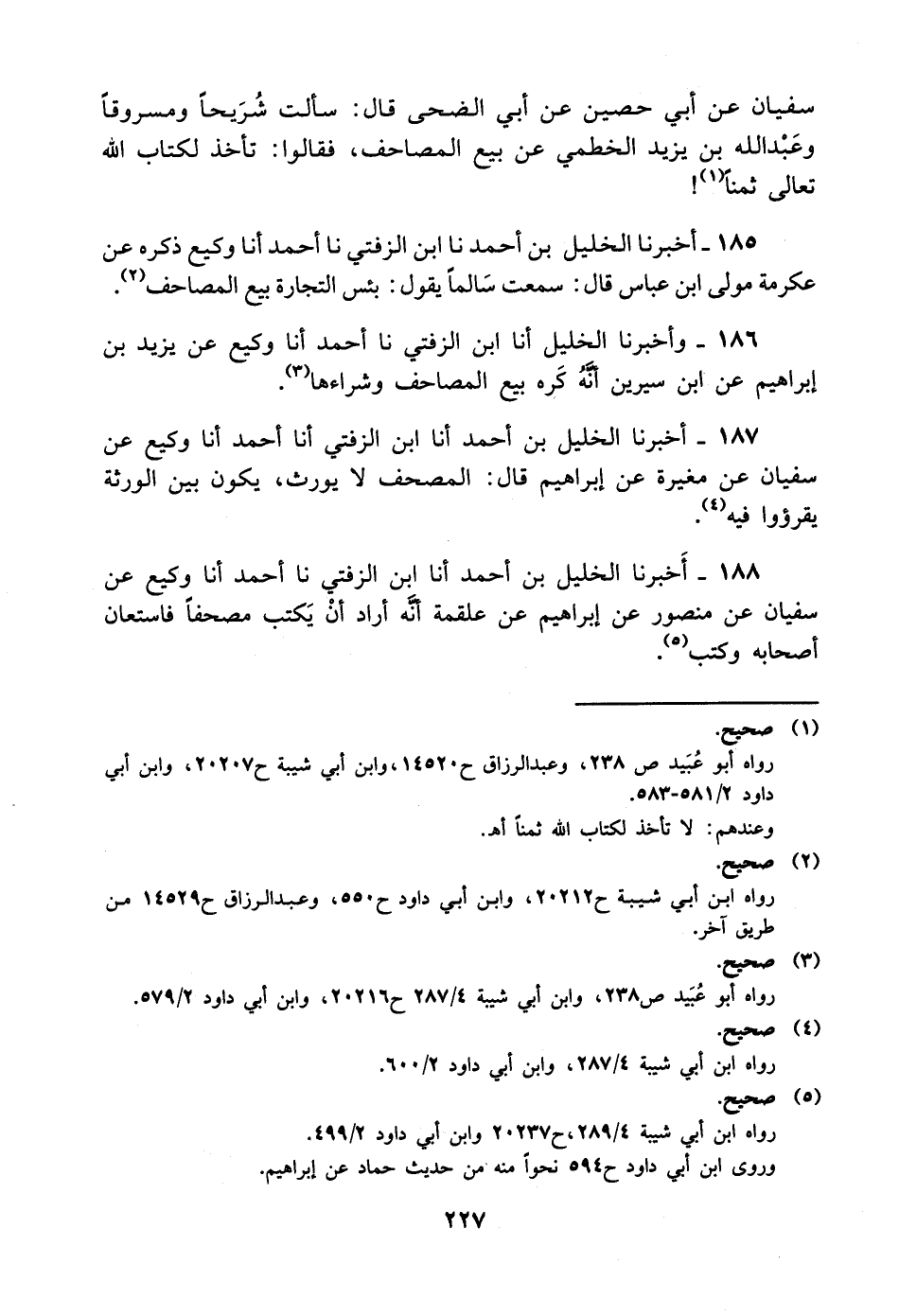 185- أخبرنا الخليل بن أحمد، حَدَّثَنا ابن الزفتي، حَدَّثَنا أحمد، أخْبَرَنا وكيع ذكره عن عكرمة مولى ابن عباس قال: سمعت سالما يقول: بئس التجارة بيع المصاحف.