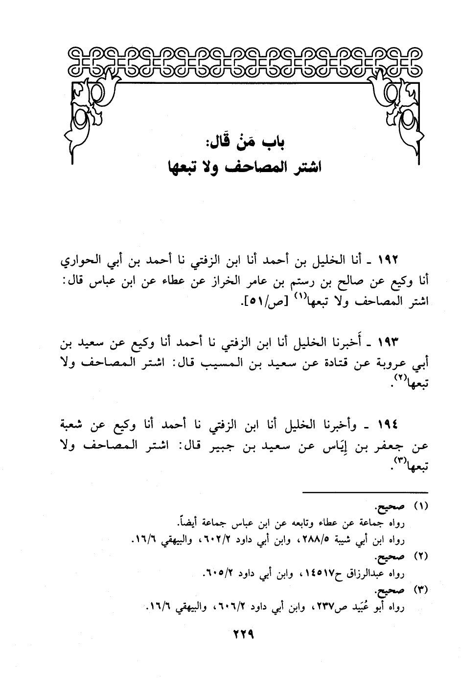 194- وأخبرنا الخليل، أَخْبَرَنا ابن الزفتي، حَدَّثَنا أحمد، أَخْبَرَنا وكيع عن شعبة عن جعفر بن إياس عن سعيد بن جبير قال: اشتر المصاحف، ولاَ تبعها.