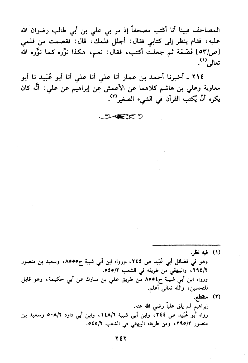 214- أخبرنا أحمد بن عمار، أخْبَرَنا عَليّ، أخْبَرَنا عَليّ، أخْبَرَنا أبو عبيد، حَدَّثَنا أبو معاوية وعلي بن هاشم كلاهما عن الأعمش عن إبراهيم عن علي: أنه كان يكره أن يكتب القرآن في الشيء الصغير.