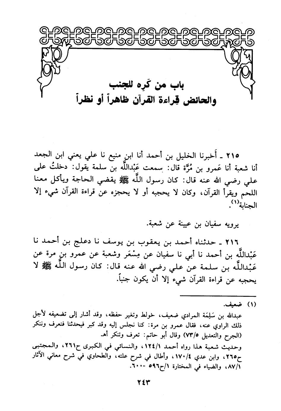 216- حدثناه أحمد بن يعقوب بن يوسف، حَدَّثَنا دعلج بن أحمد، حَدَّثَنا عبد الله بن أحمد، حَدَّثَنا أبي، حَدَّثَنا سفيان عن مسعر وشعبة عن عمرو بن مرة، عَن عَبد الله بن سلمة عن علي رضي الله عنه قال: كان رسول الله صلى الله عليه وسلم لا يحجبه عن قراءة القرآن شيء إلا أن يكون جنبا.
