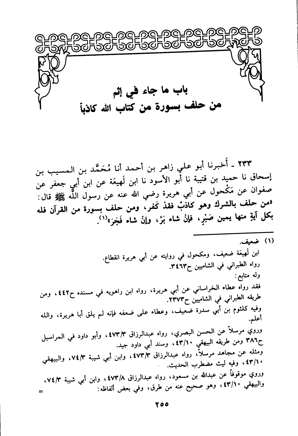 233- أخبرنا أبو علي زاهر بن أحمد بن أحمد، أَخْبَرَنا محمد بن المسيب بن إسحاق، حَدَّثَنا حميد بن قتيبة، حَدَّثَنا أبو الأسود، حَدَّثَنا ابن لهيعة عن ابن أبي جعفر عن صفوان عن مكحول، عَن أبي هريرة رضي الله عنه عن رسول الله صلى الله عليه وسلم قال: من حلف بالشرك وهو كاذب فقد كفر، وَمن حلف بسورة من القرآن فله بكل آية منها يمين صبر فإن شاء بر وإن شاء فجر.