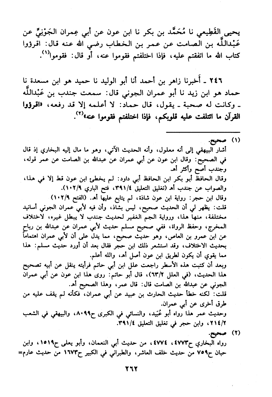 246- أخبرنا زاهر بن أحمد، أخْبَرَنا أبو الوليد، حَدَّثَنا حميد هو ابن مسعدة، حَدَّثَنا حماد هو ابن زيد، حَدَّثَنا أبو عمران الجوني قال: سمعت جندب بن عبد الله – وكانت له صحبة – يقول قال حماد: لا أعلمه إلا قد رفعه اقرؤوا القرآن ما ائتلفت عليه قلوبكم فإذا اختلفت فقوموا عنه.