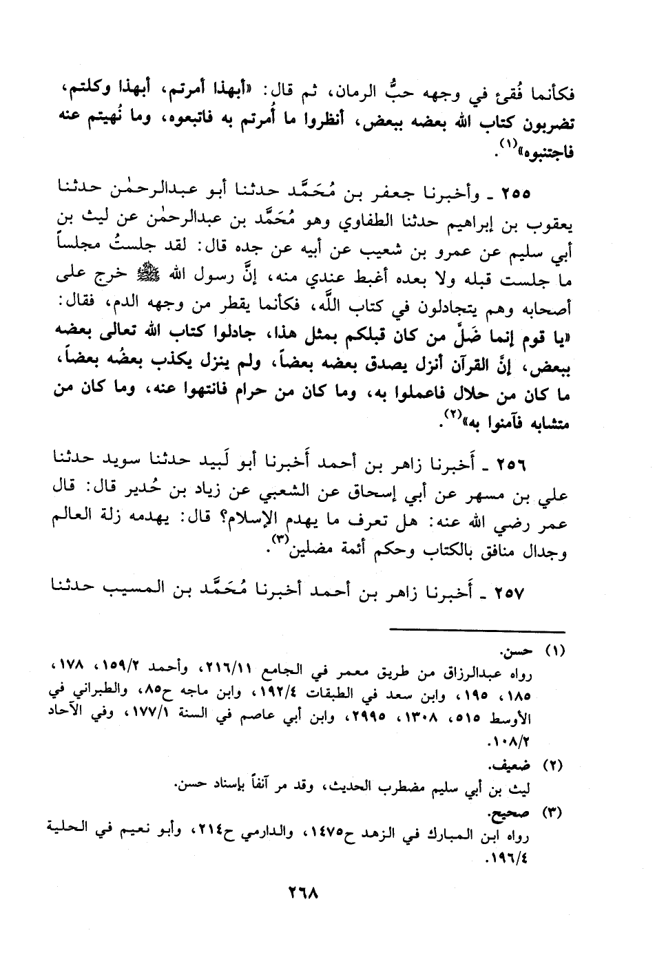 255- وأخبرنا جعفر بن محمد حدثنا أبو عبد الرحمن حدثنا يعقوب بن إبراهيم حدثنا الطفاوي وهو محمد بن عبد الرحمن عن ليث بن أبي سليم عن عمرو بن شعيب عن أبيه عن جده قال: لقد جلست مجلسا ما جلست قبله، ولاَ بعده أغبط عندي منه إن رسول الله صلى الله عليه وسلم خرج على أصحابه وهم يتجادلون في كتاب الله فكأنما يقطر من وجهه الدم فقال: ياقوم إنما ضل من كان قبلكم بمثل هذا جادلوا كتاب الله تعالى بعضه ببعض إن القرآن أنزل يصدق بعضه بعضا ولم ينزل يكذب بعضه بعضا ما كان من حلال فاعملوا به وما كان من حرام فانتهوا عنه وما كان من متشابه فآمنوا به.