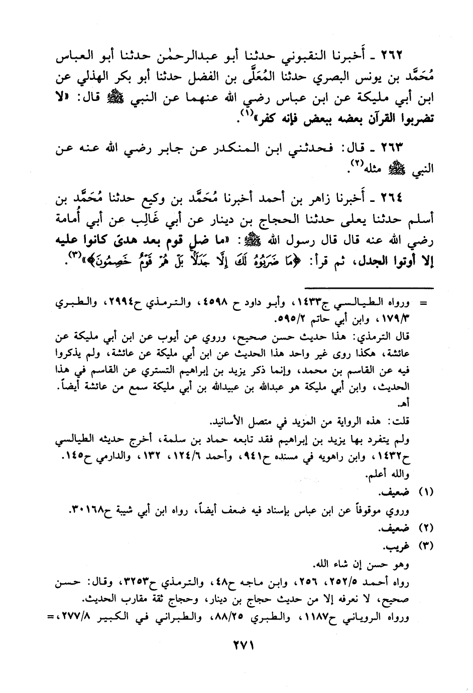 262- أخبرنا النقبوني حدثنا أبو عبد الرحمن حدثنا أبو العباس محمد بن يونس البصري حدثنا المعلى بن الفضل حدثنا أبو بكر الهذلي عن ابن أبي مليكة عن ابن عباس رضي الله عنهما عن النبي صلى الله عليه وسلم قال: لا تضربوا القرآن بعضه ببعض فإنه كفر.