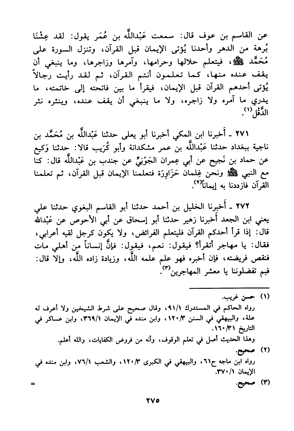 271- أخبرنا ابن المكي أخبرنا أبو يعلى حدثنا عبد الله بن محمد بن ناجية ببغداد حدثنا عبد الله بن عمر مشكدانة وأبو كريب قالا: حدثنا وكيع عن حماد بن نجيح، عَن أبي عمران الجوني عن جندب بن عبد الله قال: كنا مع النبي صلى الله عليه وسلم ونحن غلمان حزاورة فتعلمنا الإيمان قبل القرآن ثم تعلمنا القرآن فازددنا به إيمانا.