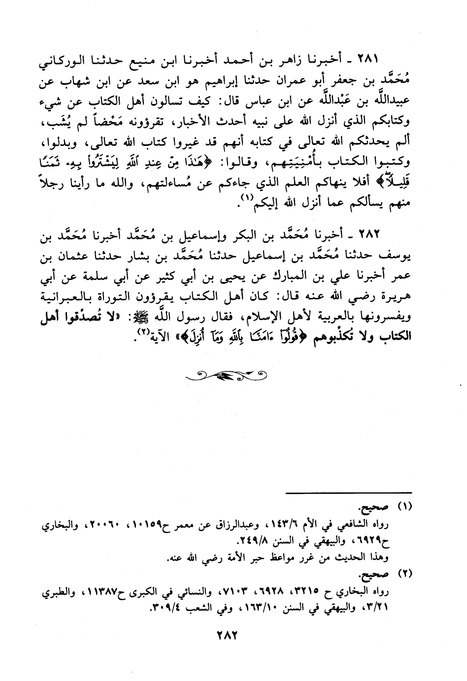 282- أخبرنا محمد بن البكر وإسماعيل بن محمد أخبرنا محمد بن يوسف حدثنا محمد بن إسماعيل حدثنا محمد بن بشار حدثنا عثمان بن عمر أخبرنا علي بن المبارك عن يحيى بن أبي كثير، عَن أبي سلمة، عَن أبي هريرة رضي الله عنه قال: كان أهل الكتاب يقرؤون التوراة بالعبرانية ويفسرونها بالعربية لأهل الإسلام فقال رسول الله صلى الله عليه وسلم لا تصدقوا أهل الكتاب، ولاَ تكذبوهم {قولوا ءامنا بالله وما أنزل} الآية