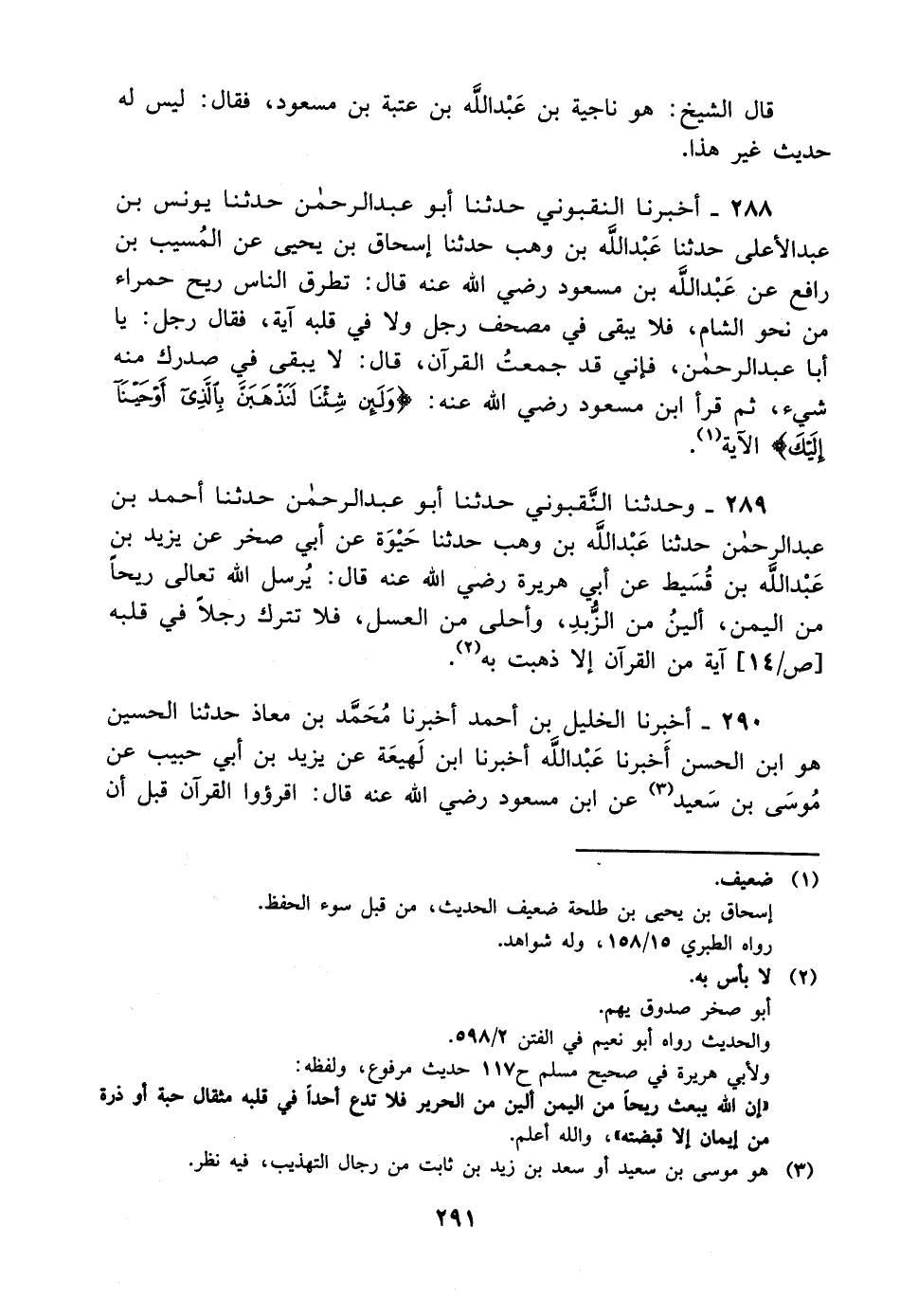 288- أخبرنا النقبوني حدثنا أبو عبد الرحمن حدثنا يونس بن عبد الأعلى حدثنا عبد الله بن وهب حدثنا إسحاق بن يحيى عن المسيب بن رافع، عَن عَبد الله بن مسعود رضي الله عنه قال: تطرق الناس ريح حمراء من نحو الشام فلا يبقى في مصحف رجل، ولاَ في قلبه آية فقال رجل: ياأبا عبد الرحمن فإني قد جمعت القرآن قال: لا يبقى في صدرك منه شيء ثم قرأ ابن مسعود رضي الله عنه {ولئن شئنا لنذهبن بالذي أوحينا إليك} الآية.