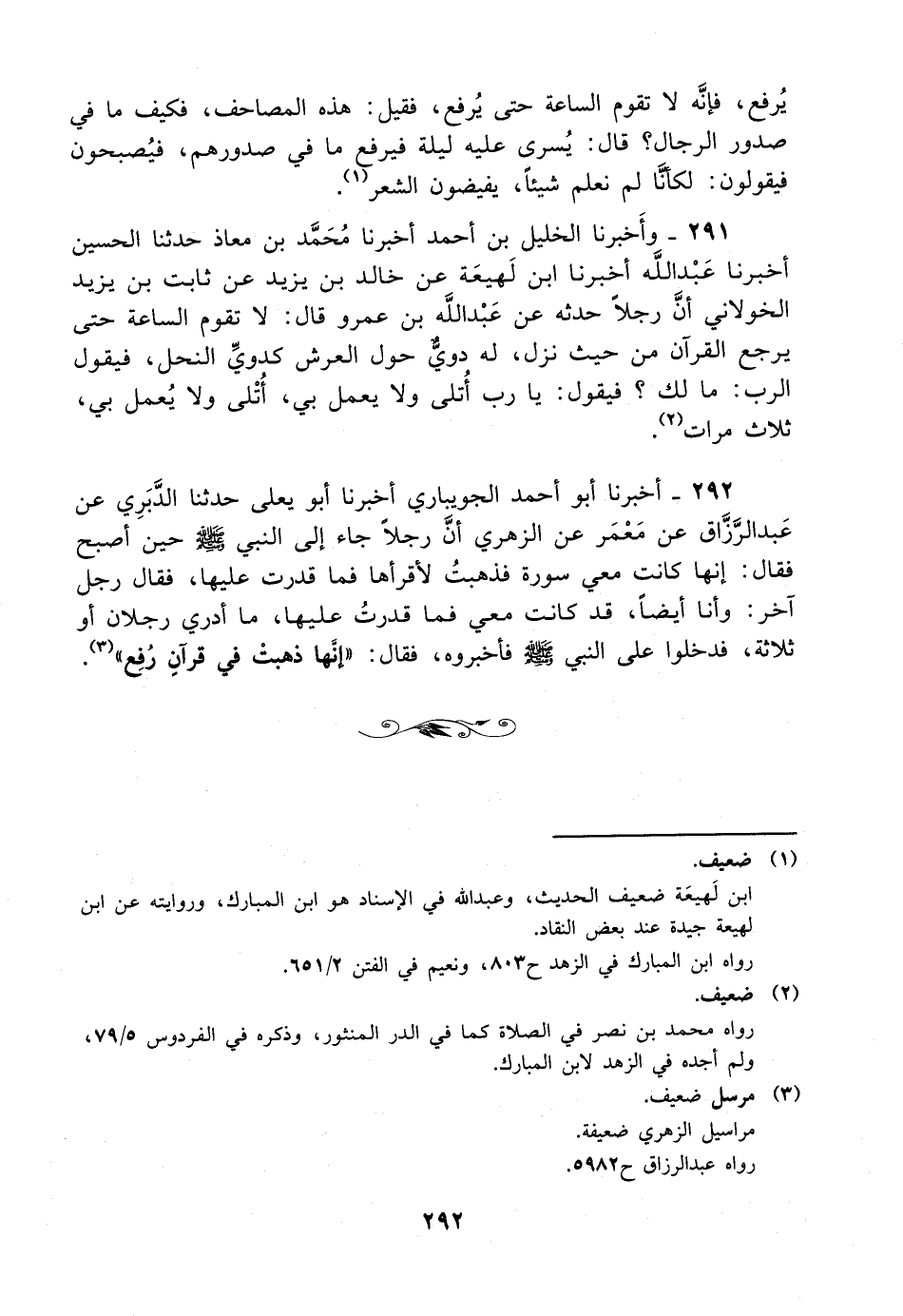 291- وأخبرنا الخليل بن أحمد أخبرنا محمد بن معاذ حدثنا الحسين أخبرنا عبد الله أخبرنا ابن لهيعة عن خالد بن يزيد عن ثابت بن يزيد الخولاني أن رجلا حدثه، عَن عَبد الله بن عمرو قال: لا تقوم الساعة حتى يرجع القرآن من حيث نزل له دوي حول العرش كدوي النحل فيقول الرب: ما لك؟ فيقول: يارب أتلى، ولاَ يعمل بي أتلى، ولاَ يعمل بي ثلاث مرات.