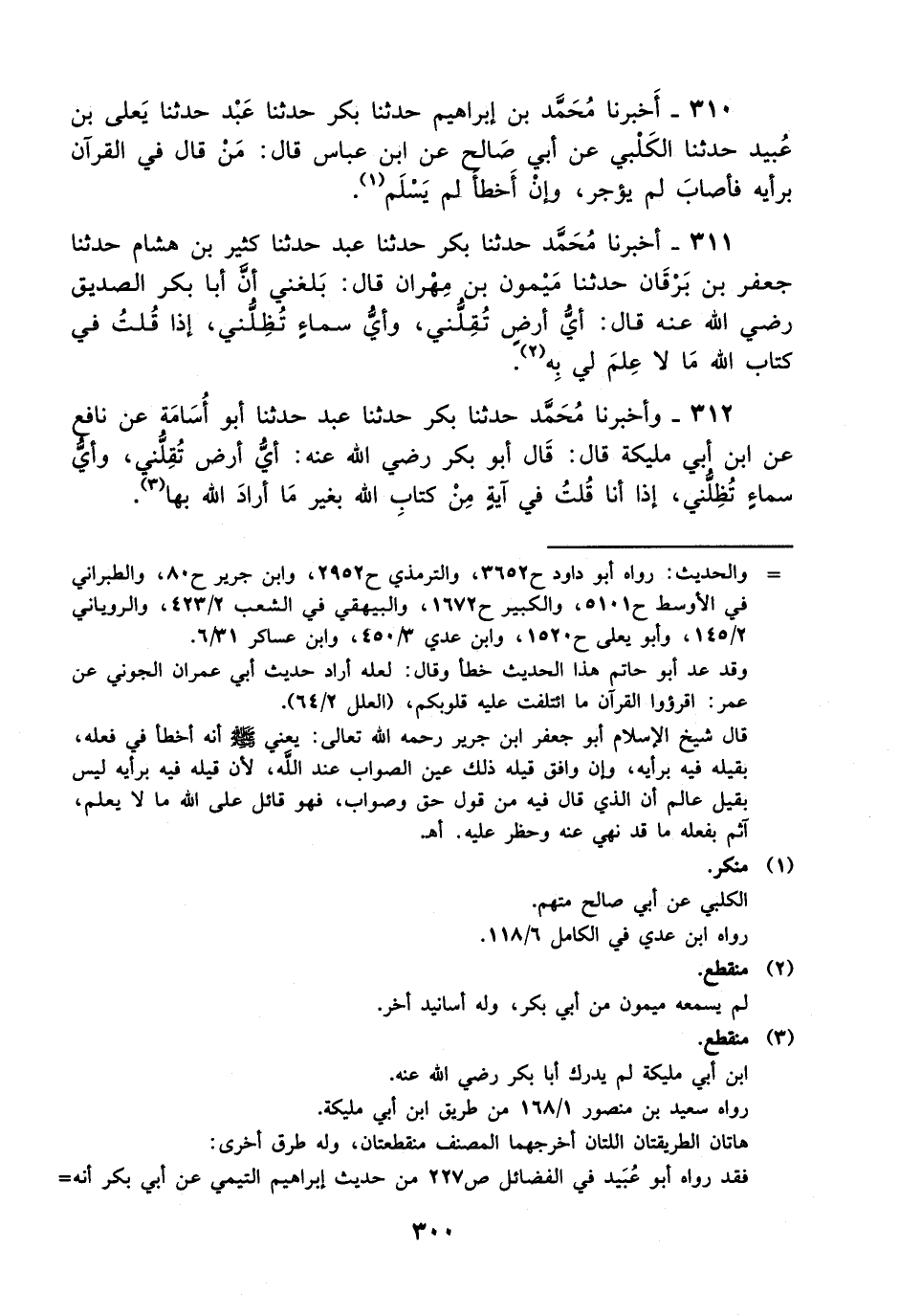 310- أخبرنا محمد بن إبراهيم حدثنا بكر حدثنا عبد حدثنا يعلى بن عبيد حدثنا الكلبي، عَن أبي صالح عن ابن عباس قال: من قال في القرآن برأيه فأصاب لم يؤجر وإن أخطأ لم يسلم.