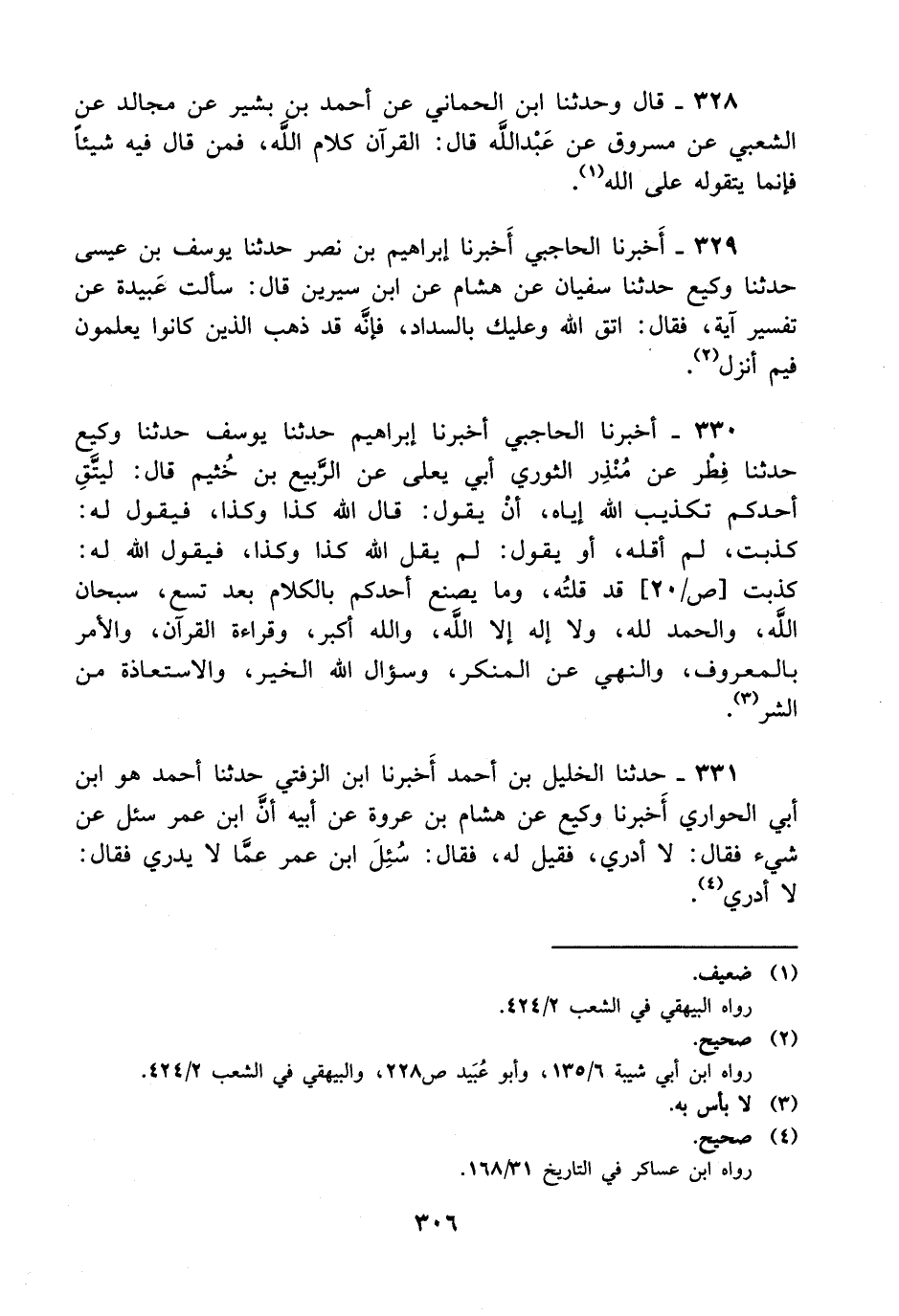 328- قال وحدثنا ابن الحماني عن أحمد بن بشير عن مجالد عن الشعبي عن مسروق، عَن عَبد الله قال: القرآن كلام الله فمن قال فيه شيئا فإنما يتقوله على الله.
