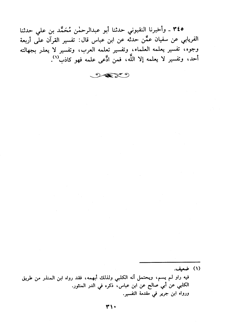 345- وأخبرنا النقبوني حدثنا أبو عبد الرحمن محمد بن علي حدثنا الفريابي عن سفيان عمن حدثه عن ابن عباس قال: تفسير القرآن على أربعة وجوه تفسير يعلمه العلماء وتفسير تعلمه العرب وتفسير لا يعذر بجهالته أحد وتفسير لا يعلمه إلا الله فمن ادعى علمه فهو كاذب.
