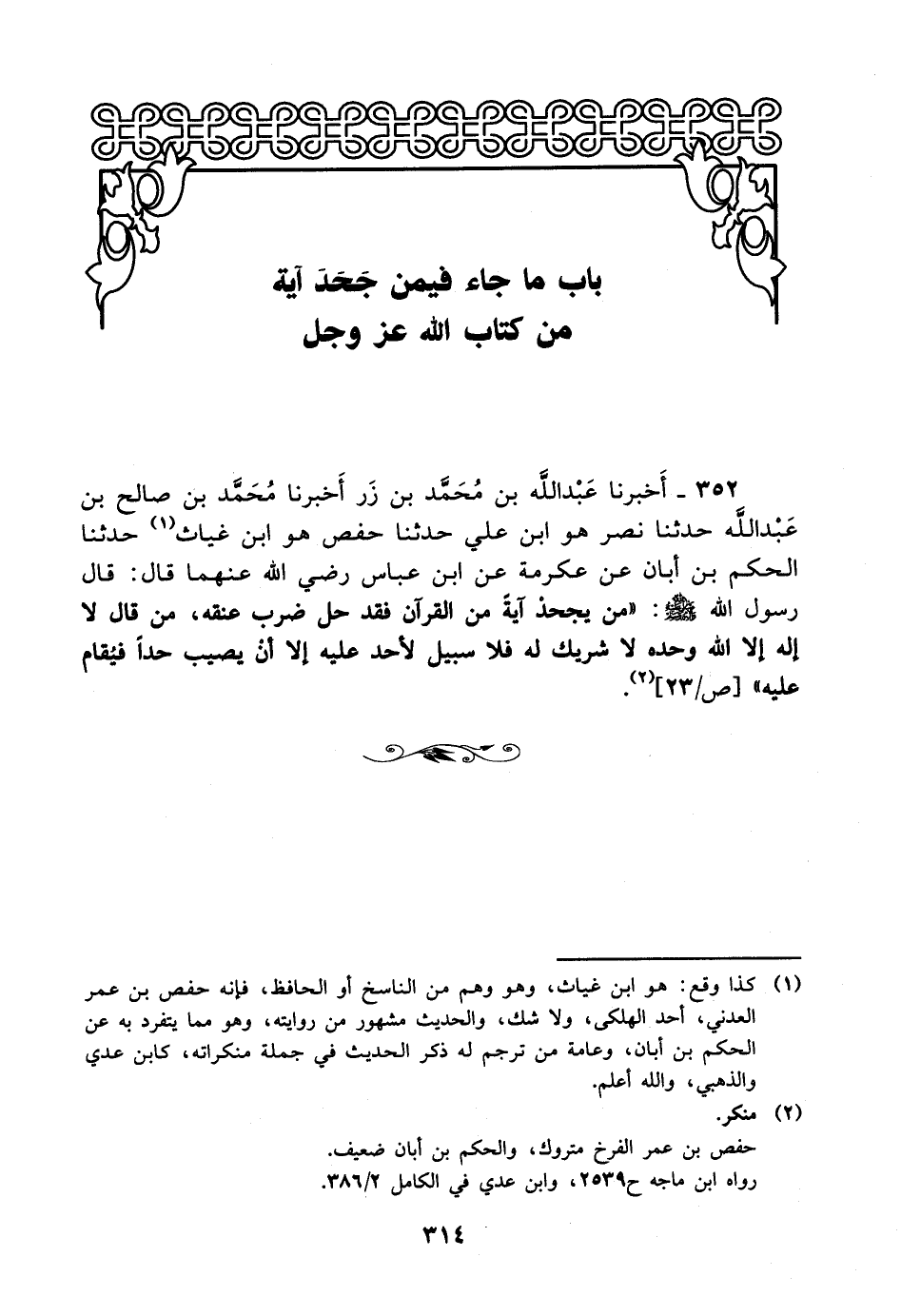 352- أخبرنا عبد الله بن محمد بن زر أخبرنا محمد بن صالح بن عبد الله حدثنا نصر هو ابن علي حدثنا حفص هو ابن غياث حدثنا الحكم بن أبان عن عكرمة عن ابن عباس رضي الله عنهما قال: قال رسول الله صلى الله عليه وسلم: من يجحد آية من القرآن فقد حل ضرب عنقه من قال لا إله إلا الله وحده لا شريك له فلا سبيل لأحد عليه إلا أن يصيب حدا فيقام عليه.