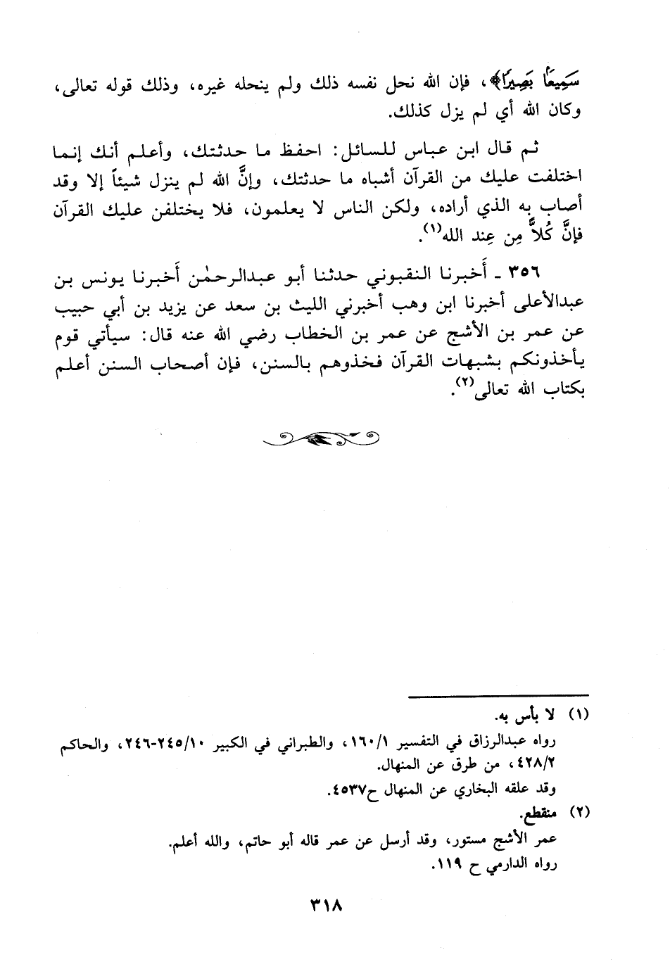 356- أخبرنا النقبوني حدثنا أبو عبد الرحمن أخبرنا يونس بن عبد الأعلى أخبرنا ابن وهب أخبرني الليث بن سعد عن يزيد بن أبي حبيب عن عمر بن الأشج عن عمر بن الخطاب رضي الله عنه قال: سيأتي قوم يأخذونكم بشبهات القرآن فخذوهم بالسنن فإن أصحاب السنن أعلم بكتاب الله تعالى.