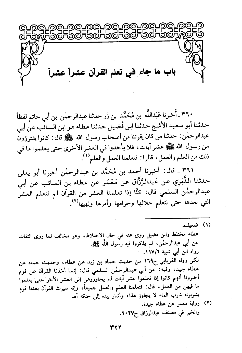360- أخبرنا عبد الله بن محمد بن زر حدثنا عبد الرحمن بن أبي حاتم لفظا حدثنا أبو سعيد الأشج حدثنا ابن فضيل حدثنا عطاء هو ابن السائب، عَن أبي عبد الرحمن: حدثنا من كان يقرئنا من أصحاب رسول الله صلى الله عليه وسلم قال: كانوا يقترؤون من رسول الله صلى الله عليه وسلم عشر آيات فلا يأخذوا في العشر الآخرى حتى يعلموا ما في ذلك من العلم والعمل قالوا: فتعلمنا العمل والعلم.