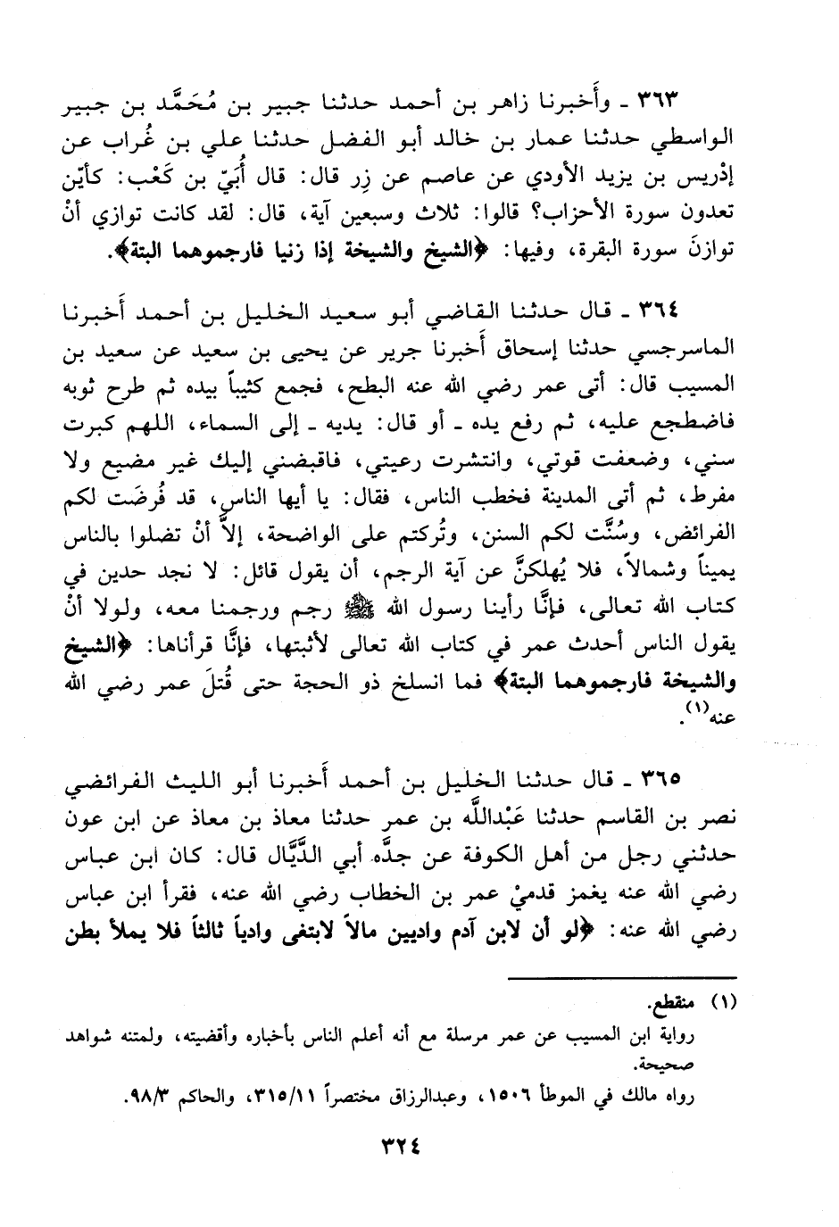 364- قال حدثنا القاضي أبو سعيد الخليل بن أحمد أخبرنا الماسرجسي حدثنا إسحاق أخبرنا جرير عن يحيى بن سعيد عن سعيد بن المسيب قال: أتى عمر رضي الله عنه البطح فجمع كثيبا بيده ثم طرح ثوبه فاضطجع عليه ثم رفع يده – أو قال: يديه – إلى السماء اللهم كبرت سني وضعفت قوتي وانتشرت رعيتي فاقبضني إليك غير مضيع، ولاَ مفرط ثم أتى المدينة فخطب الناس فقال: يا أيها الناس قد فرضت لكم الفرائض وسنت لكم السنن وتركتم على الواضحة إلا أن تضلوا بالناس يمينا وشمالا فلا يهلكن عن آية الرجم أن يقول قائل: لا نجد حدين في كتاب الله تعالى فإنا رأينا رسول الله صلى الله عليه وسلم رجم ورجمنا معه ولولا أن يقول الناس أحدث عمر في كتاب الله تعالى لأثبتها فإنا قرأناها {الشيخ والشيخة فارجموهما} فما انسلخ ذو الحجة حتى قتل عمر رضي الله عنه.