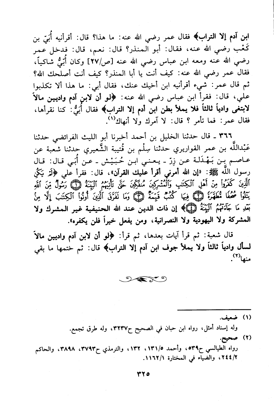 366- قال حدثنا الخليل بن أحمد أخبرنا أبو الليث الفرائضي حدثنا عبد الله بن عمر القواريري حدثنا سلم بن قتيبة الشعيري حدثنا شعبة عن عاصم بن بهدلة عن زر – يعني ابن حبيش –، عَن أبي قال: قال رسول الله صلى الله عليه وسلم: إن الله أمرني أقرأ عليك القرآن قال: فقرأ علي {لم يكن الذين كفروا من أهل الكتاب والمشركين منفكين حتى تأتيهم البينة. رسول من الله يتلوا صحفا مطهرة. فيها كتب قيمة. وما تفرق الذين أوتوا الكتاب إلا من بعد ما جاءتهم البينة} إن ذات الدين عند الله الحنيفية غير المشرك، ولاَ المشركة، ولاَ اليهودية، ولاَ النصرانية، وَمن يفعل خيرا فلن يكفره.