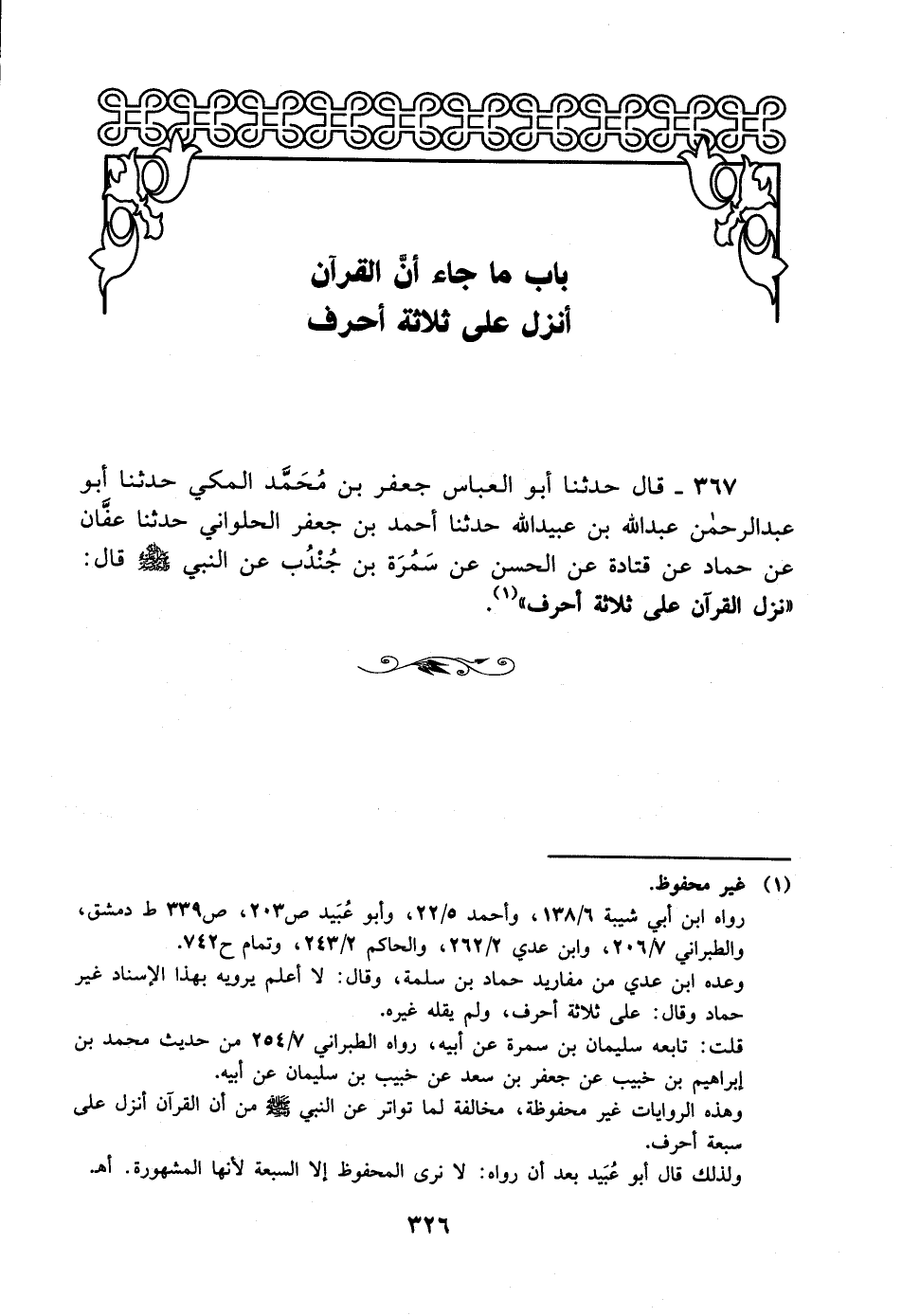 367- قال حدثنا أبو العباس جعفر بن محمد المكي حدثنا أبو عبد الرحمن عبد الله بن عبيد الله حدثنا أحمد بن جعفر الحلواني حدثنا عفان عن حماد عن قتادة عن الحسن عن سمرة بن جندب عن النبي صلى الله عليه وسلم قال: نزل القرآن على ثلاثة أحرف.