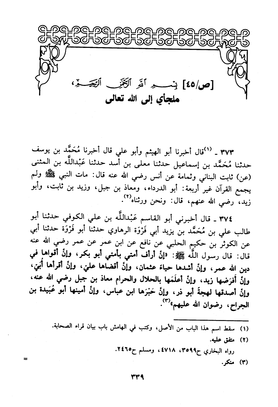 373- قال أخبرنا أبو الهيثم وأبو علي قال أخبرنا محمد بن يوسف حدثنا محمد بن إسماعيل حدثنا معلى بن أسد حدثنا عبد الله بن المثنى عن ثابت البناني وثمامة عن أنس رضي الله عنه قال: مات النبي صلى الله عليه وسلم ولم يجمع القرآن غير أربعة: أبو الدرداء ومعاذ بن جبل وزيد بن ثابت وأبو زيد رضي الله عنهم قال: ونحن ورثناه.