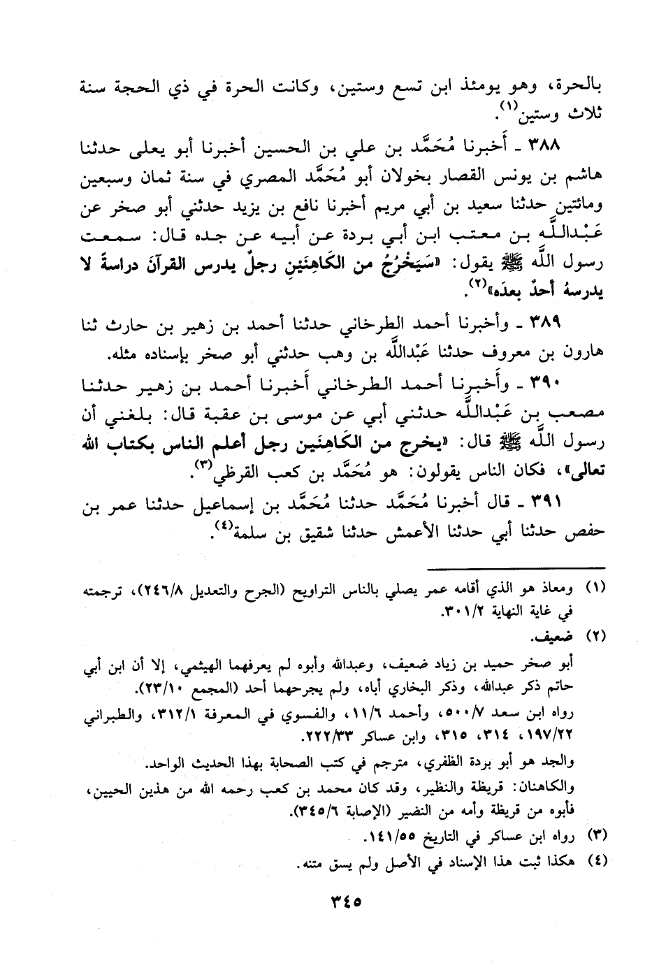 390- وأخبرنا أحمد الطرخاني أخبرنا أحمد بن زهير حدثنا مصعب بن عبد الله حدثني أبي عن موسى بن عقبة قال: بلغني أن رسول الله صلى الله عليه وسلم قال: يخرج من الكاهنين رجل أعلم الناس بكتاب الله تعالى فكان الناس يقولون: هو محمد بن كعب القرظي.