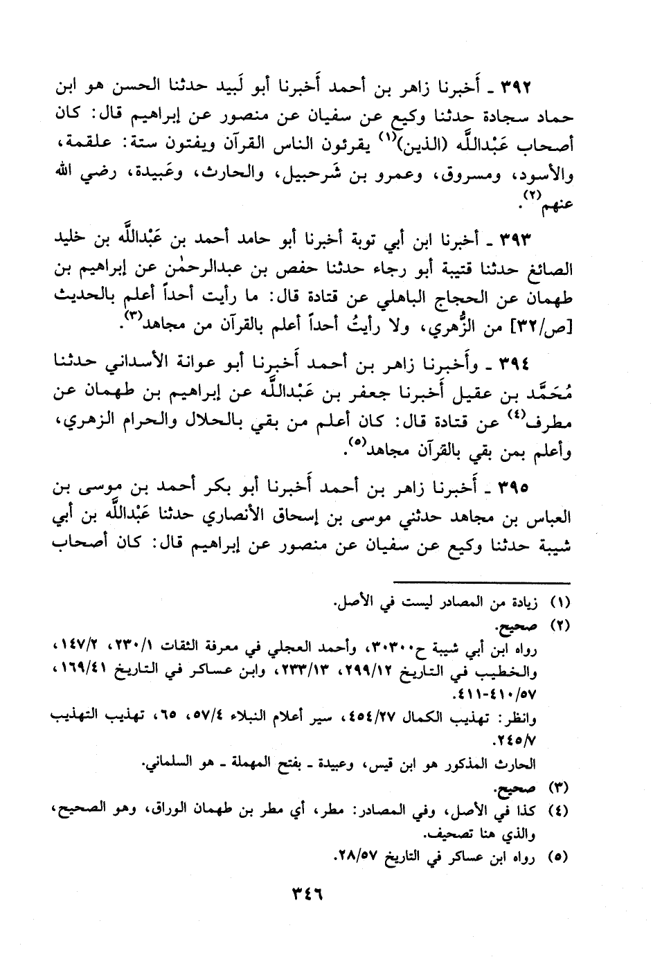 395- أخبرنا زاهر بن أحمد أخبرنا أبو بكر أحمد بن موسى بن العباس بن مجاهد حدثني موسى بن إسحاق الأنصاري حدثنا عبد الله بن أبي شيبة حدثنا وكيع عن سفيان عن منصور عن إبراهيم قال: كان أصحاب -[347]- عبد الله الذين يقرئون الناس القرآن ويفتون: علقمة والأسود بن يزيد ومسروق بن الأجدع والحارث بن قيس وعمرو بن شرحبيل وعبيدة السلماني.