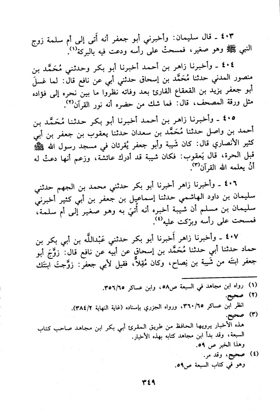 406- وأخبرنا زاهر أخبرنا أبو بكر حدثني محمد بن الجهم حدثني سليمان بن داود الهاشمي حدثنا إسماعيل بن جعفر بن أبي كثير أخبرني سليمان بن مسلم أن شيبة أخبره أنه أتى به وهو صغير إلى أم سلمة فمسحت على رأسه وبركت عليه.