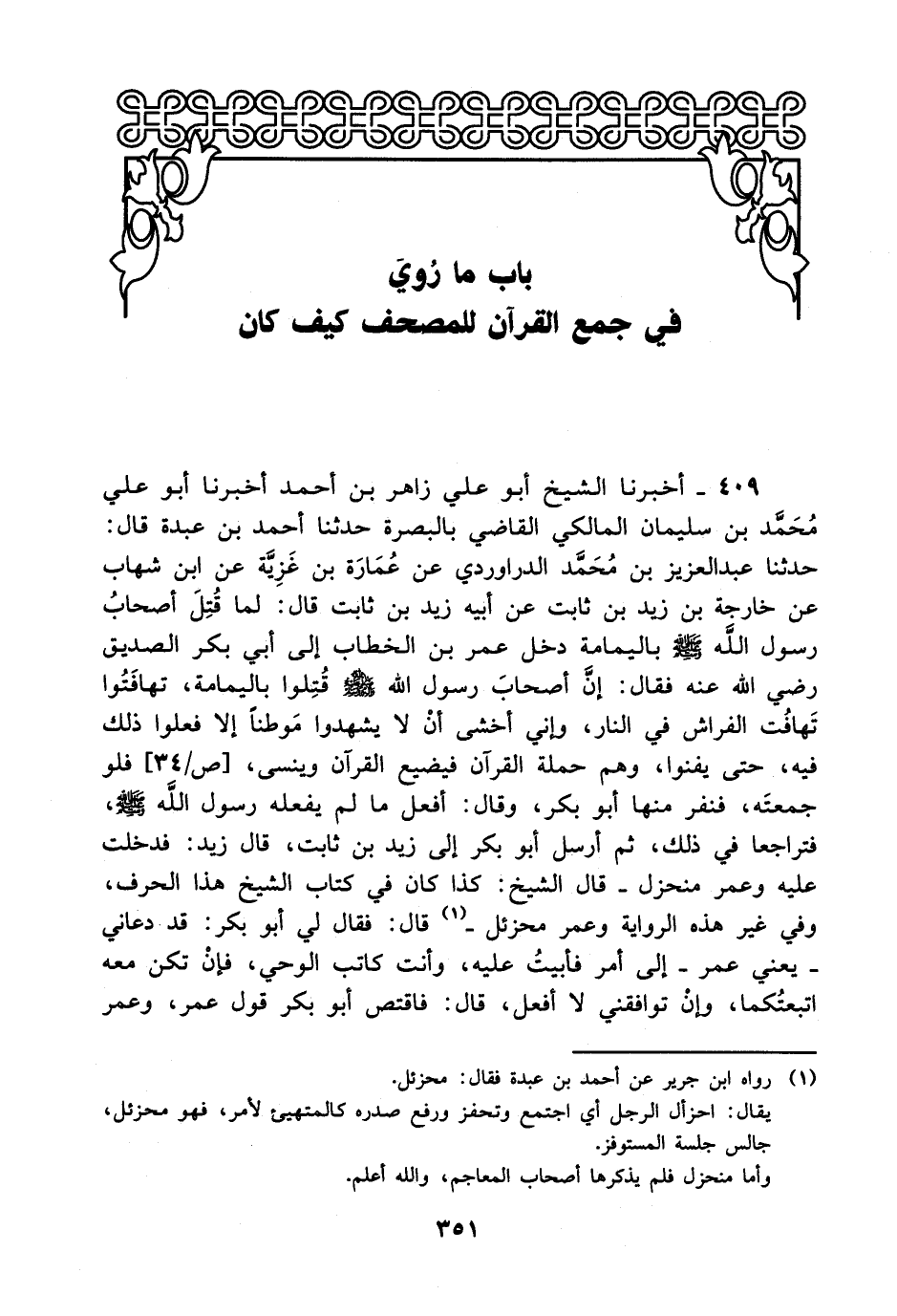 409- أخبرنا الشيخ أبو علي زاهر بن أحمد أخبرنا أبو علي محمد بن سليمان المالكي القاضي بالبصرة حدثنا أحمد بن عبدة قال: حدثنا عبد العزيز بن محمد الدراوردي عن عمارة بن غزية عن ابن شهاب عن خارجة بن زيد بن ثابت عن أبيه زيد بن ثابت قال: لما قتل أصحاب رسول الله صلى الله عليه وسلم باليمامة دخل عمر بن الخطاب إلى أبي بكر الصديق رضي الله عنه فقال: إن أصحاب رسول الله صلى الله عليه وسلم قتلوا باليمامة تهافتوا تهافت الفراش في النار وإني أخشى أن لا يشهدوا موطنا إلا فعلوا ذلك فيه حتى يفنوا وهم حملة القرآن فيضيع القرآن وينسى فلو جمعته فنفر منها أبو بكر وقال: أفعل ما لم يفعله رسول الله صلى الله عليه وسلم فتراجعا في ذلك ثم أرسل أبو بكر إلى زيد بن ثابت قال زيد: فدخلت عليه وعمر منحزل – قال الشيخ: كذا كان في كتاب الشيخ هذا الحرف وفي غير هذه الرواية وعمر محزئل – قال: فقال لي أبو بكر: قد دعاني – يعني عمر – إلى أمر فأبيت عليه وأنت كاتب الوحي فإن تكن معه اتبعتكما وإن توافقني لا أفعل