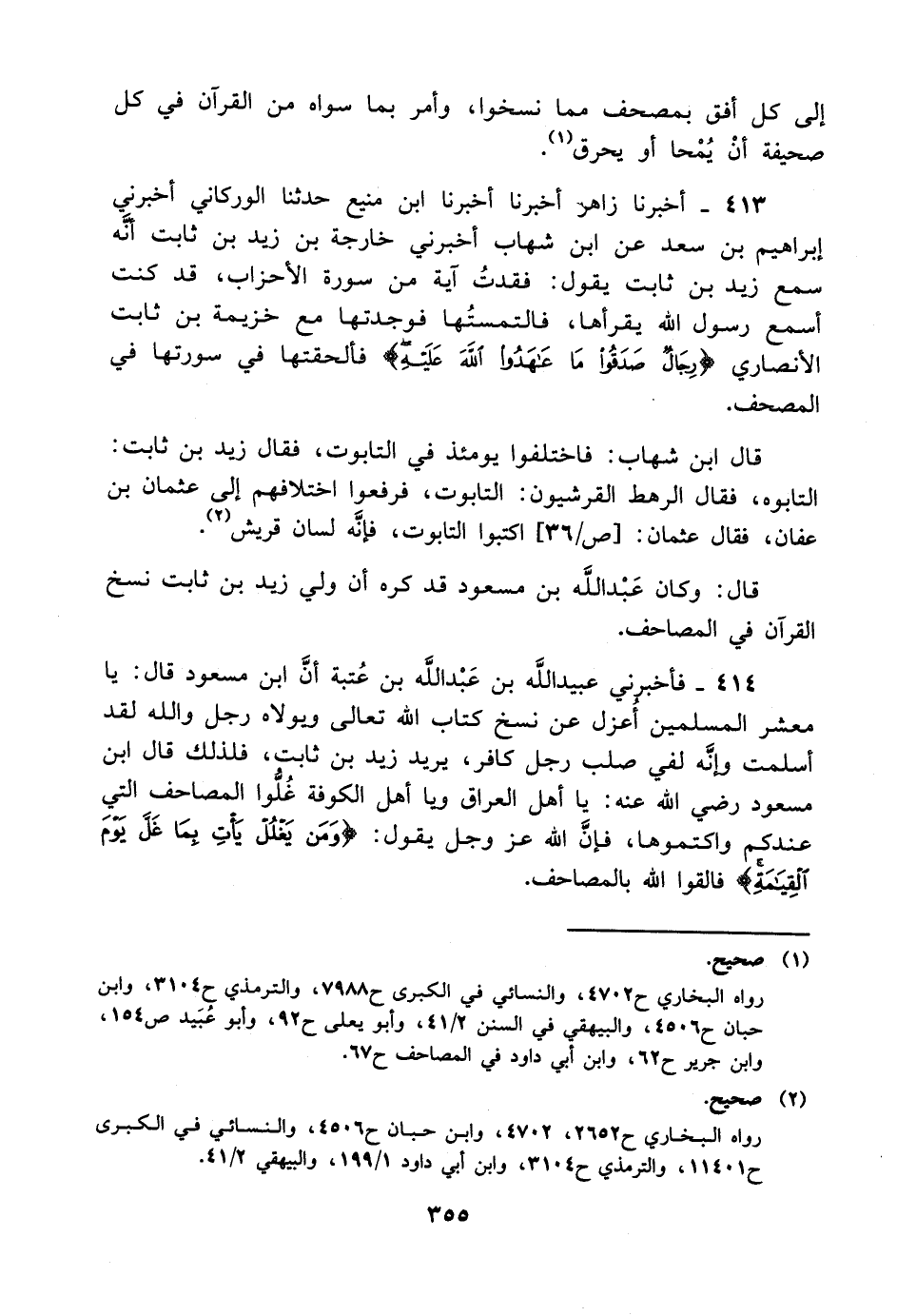 414- فأخبرني عبيد الله بن عبد الله بن عتبة أن ابن مسعود قال: يامعشر المسلمين أعزل عن نسخ كتاب الله تعالى ويولاه رجل والله لقد أسلمت وإنه لفي صلب رجل كافر يريد زيد بن ثابت فلذلك قال ابن مسعود رضي الله عنه: ياأهل العراق ويا أهل الكوفة غلوا المصاحف التي عندكم واكتموها فإن الله عز وجل يقول {ومن يغلل يأت بما غل يوم القيامة} فالقوا الله بالمصاحف.