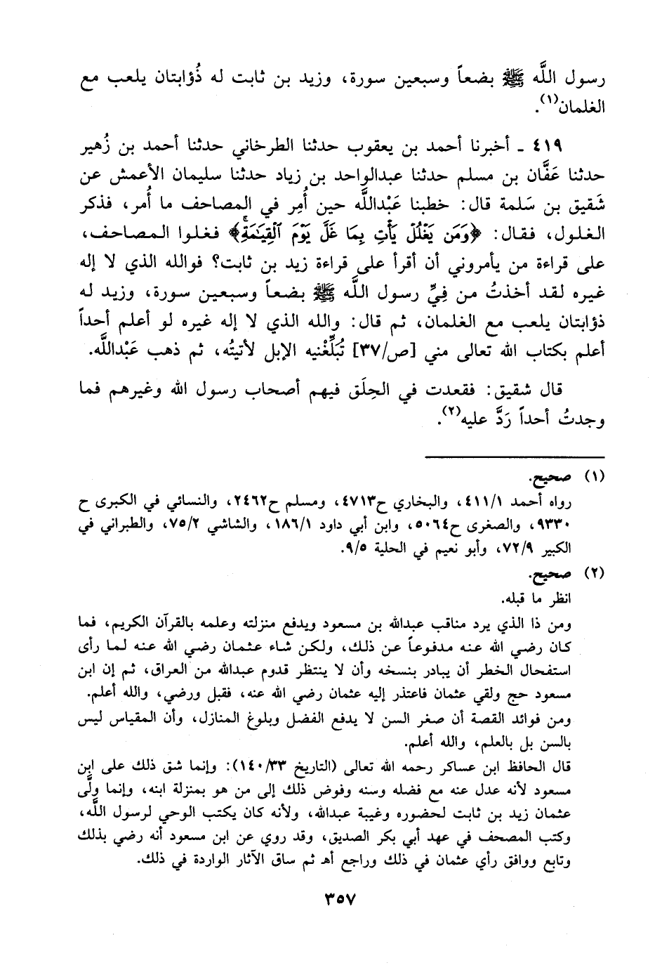 419- أخبرنا أحمد بن يعقوب حدثنا الطرخاني حدثنا أحمد بن زهير حدثنا عفان بن مسلم حدثنا عبد الواحد بن زياد حدثنا سليمان الأعمش عن شقيق بن سلمة قال: خطبنا عبد الله حين أمر في المصاحف ما أمر فذكر الغلول فقال {ومن يغلل يأت بما غل يوم القيامة} فغلوا المصاحف على قراءة من يأمروني أن أقرأ على قراءة زيد بن ثابت؟ فوالله الذي لا إله غيره لقد أخذت من في رسول الله صلى الله عليه وسلم بضعا وسبعين سورة وزيد له ذؤابتان يلعب مع الغلمان ثم قال: والله الذي لا إله غيره لو أعلم أحدا أعلم بكتاب الله تعالى مني تبلغنيه الإبل لأتيته ثم ذهب عبد الله.
