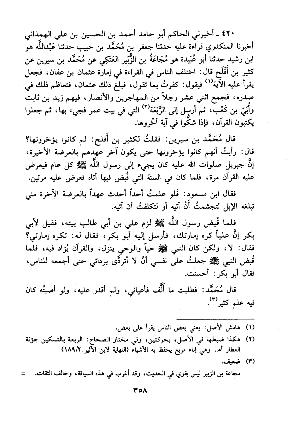 420- أخبرني الحاكم أبو حامد أحمد بن الحسين بن علي الهمداني أخبرنا المنكدري قراءة عليه حدثنا جعفر بن محمد بن حبيب حدثنا عبد الله هو ابن رشيد حدثنا أبو عبيدة هو مجاعة بن الزبير العتكي عن محمد بن سيرين عن كثير بن أفلح قال: اختلف الناس في القراءة في إمارة عثمان بن عفان فجعل يقرأ عليه الآية، فيقول: كفرت بما تقول، فبلغ ذلك عثمان فتعاظم ذلك في صدره فجمع اثني عشر رجلا من المهاجرين والأنصار فيهم زيد بن ثابت وأبي بن كعب ثم أرسل إلى الربعة التي في بيت عمر فجئ بها ثم جعلوا يكتبون القرآن فإذا شكوا في آية أخروها.