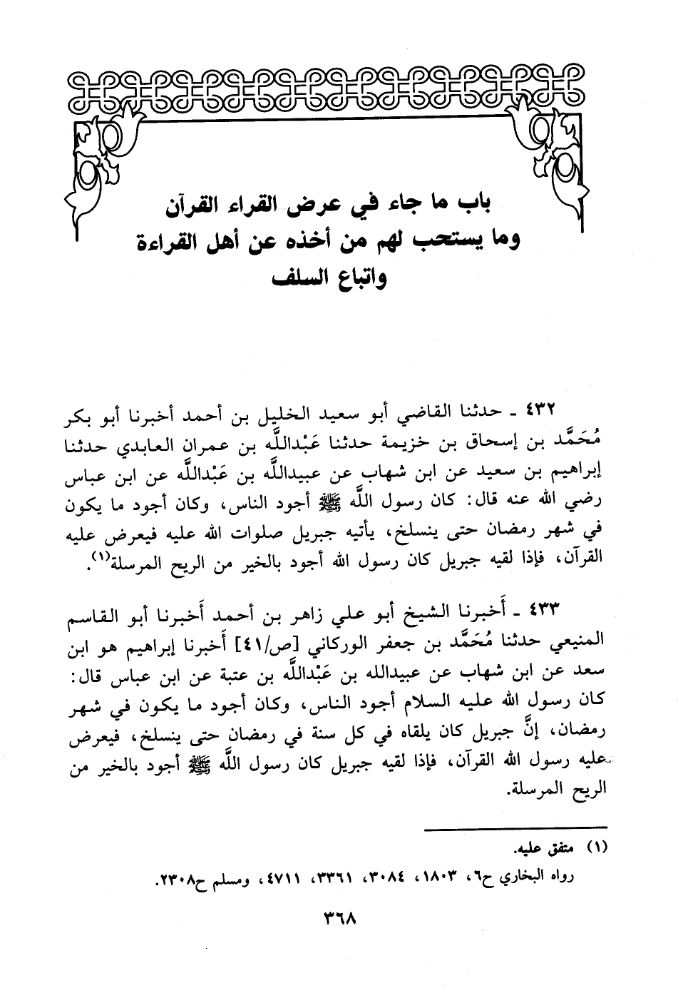 433- أخبرنا الشيخ أبو علي زاهر بن أحمد أخبرنا أبو القاسم المنيعي حدثنا محمد بن جعفر الوركاني أخبرنا إبراهيم هو ابن سعد عن ابن شهاب عن عبيد الله بن عبد الله بن عتبة عن ابن عباس قال: كان رسول الله عليه السلام أجود الناس وكان أجود ما يكون في شهر رمضان إن جبريل كان يلقاه في كل سنة في رمضان حتى ينسلخ فيعرض عليه رسول الله القرآن فإذا لقيه جبريل كان رسول الله صلى الله عليه وسلم أجود بالخير من الريح المرسلة.