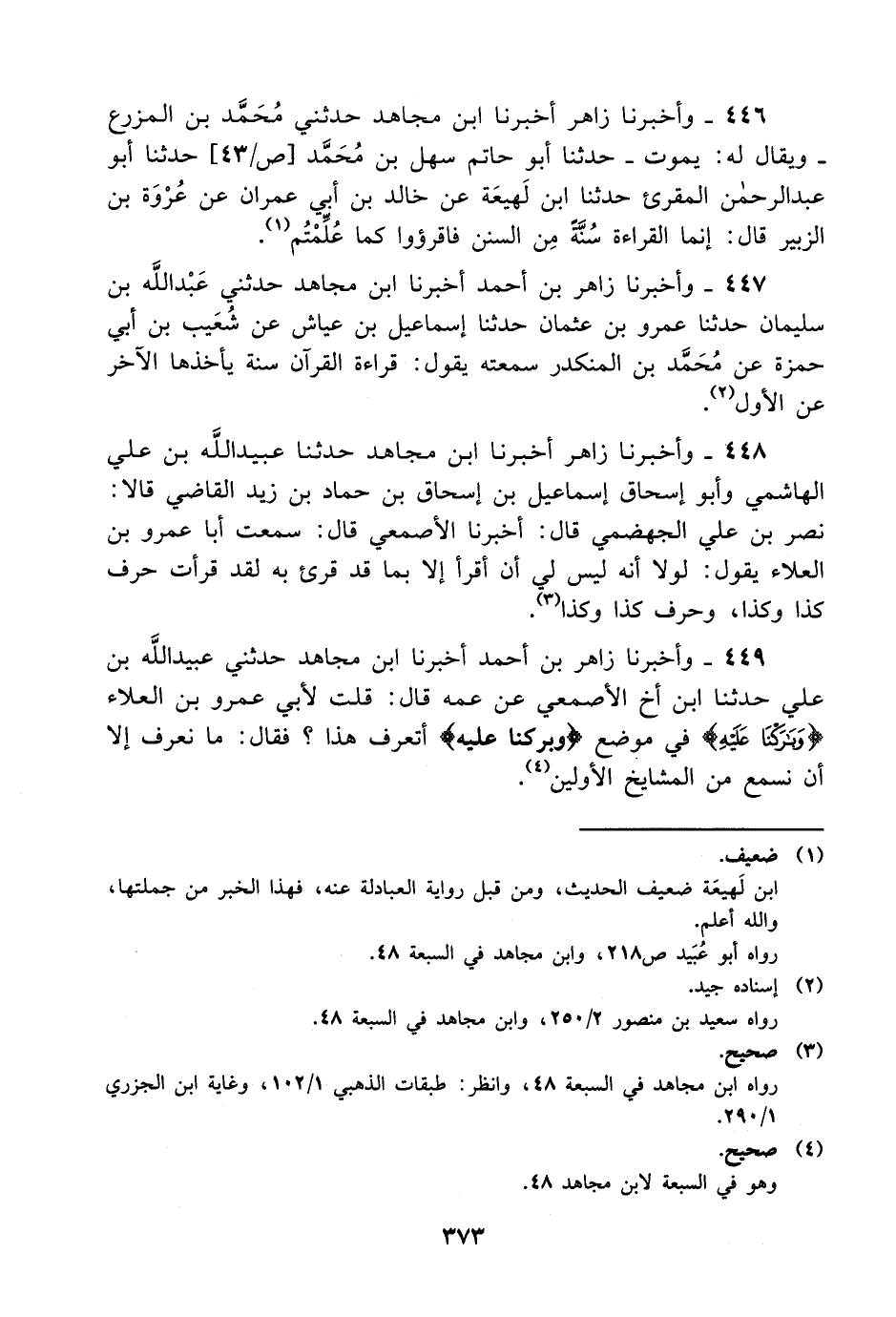 446- وأخبرنا زاهر أخبرنا ابن مجاهد حدثني محمد بن المزرع – ويقال له: يموت – حدثنا أبو حاتم سهل بن محمد حدثنا أبو عبد الرحمن المقرئ حدثنا ابن لهيعة عن خالد بن أبي عمران عن عروة بن الزبير قال: إنما القراءة سنة من السنن فاقرؤوا كما علمتم.