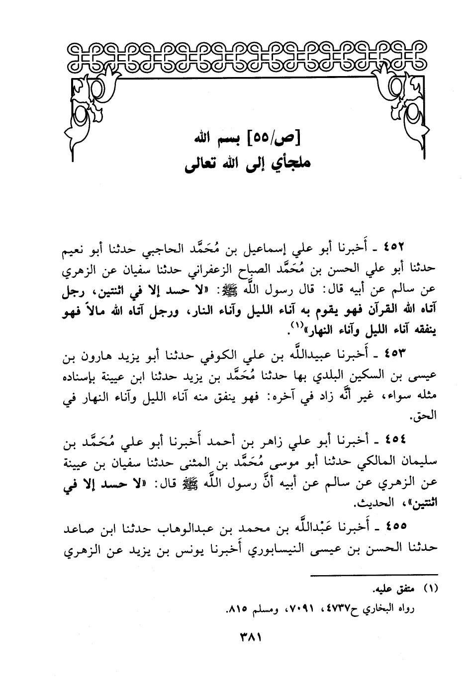 452- أخبرنا أبو علي إسماعيل بن محمد الحاجبي حدثنا أبو نعيم حدثنا أبو علي الحسن بن محمد الصباح الزعفراني حدثنا سفيان عن الزهري عن سالم عن أبيه قال: قال رسول الله صلى الله عليه وسلم: لا حسد إلا في اثنتين رجل آتاه الله القرآن فهو يقوم به آناء الليل وآناء النهار ورجل آتاه الله مالا فهو ينفقه آناء الليل وآناء النهار.