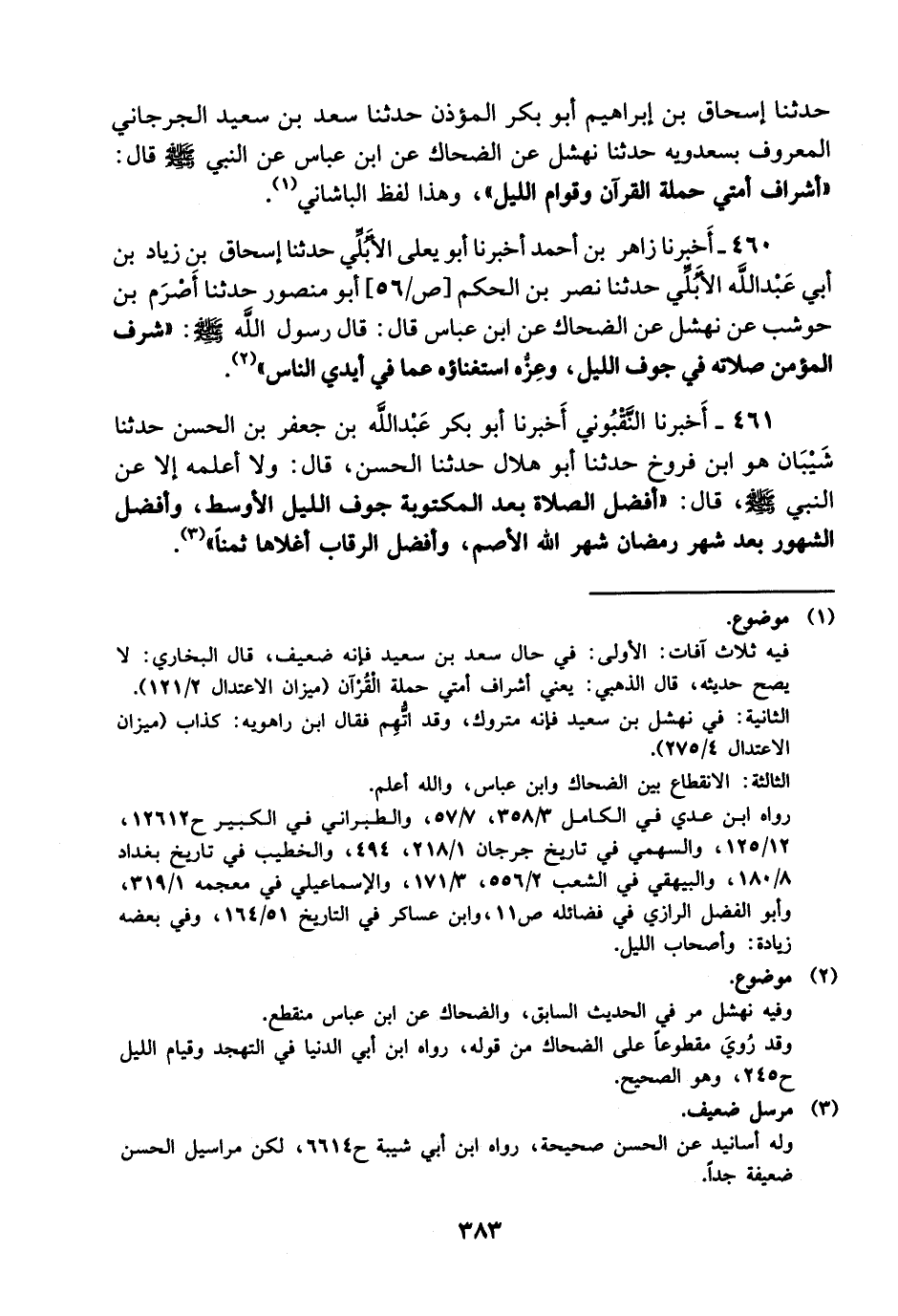 460- أخبرنا زاهر بن أحمد أخبرنا أبو يعلى الأبلي حدثنا إسحاق بن زياد بن أبي عبد الله الأبلي حدثنا نصر بن الحكم أبو منصور حدثنا أصرم بن حوشب عن نهشل عن الضحاك عن ابن عباس قال: قال رسول الله صلى الله عليه وسلم: شرف المؤمن صلاته في جوف الليل وعزه استغناؤه عما في أيدي الناس.