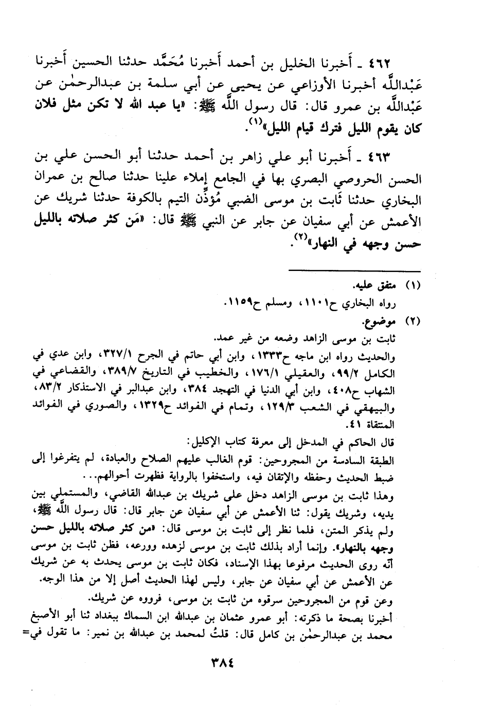 463- أخبرنا أبو علي زاهر بن أحمد حدثنا أبو الحسن علي بن الحسن الحروصي البصري بها في الجامع إملاء علينا حدثنا صالح بن عمران البخاري حدثنا ثابت بن موسى الضبي مؤذن التيم بالكوفة حدثنا شريك عن الأعمش، عَن أبي سفيان عن جابر عن النبي صلى الله عليه وسلم قال: من كثر صلاته بالليل حسن وجهه في النهار.