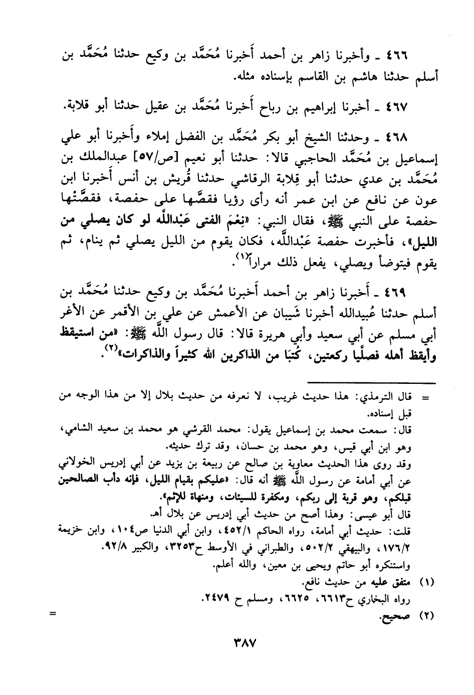 468- وحدثنا الشيخ أبو بكر محمد بن الفضل إملاء وأخبرنا أبو علي إسماعيل بن محمد الحاجبي قالا: حدثنا أبو نعيم عبد الملك بن محمد بن عدي حدثنا أبو قلابة الرقاشي حدثنا قريش بن أنس أخبرنا ابن عون عن نافع عن ابن عمر أنه رأى رؤيا فقصها على حفصة فقصتها حفصة على النبي صلى الله عليه وسلم فقال النبي: نعم الفتى عبد الله لو كان يصلي من الليل فأخبرت حفصة عبد الله فكان يقوم من الليل يصلي ثم ينام ثم يقوم فيتوضأ ويصلي يفعل ذلك مرارا.
