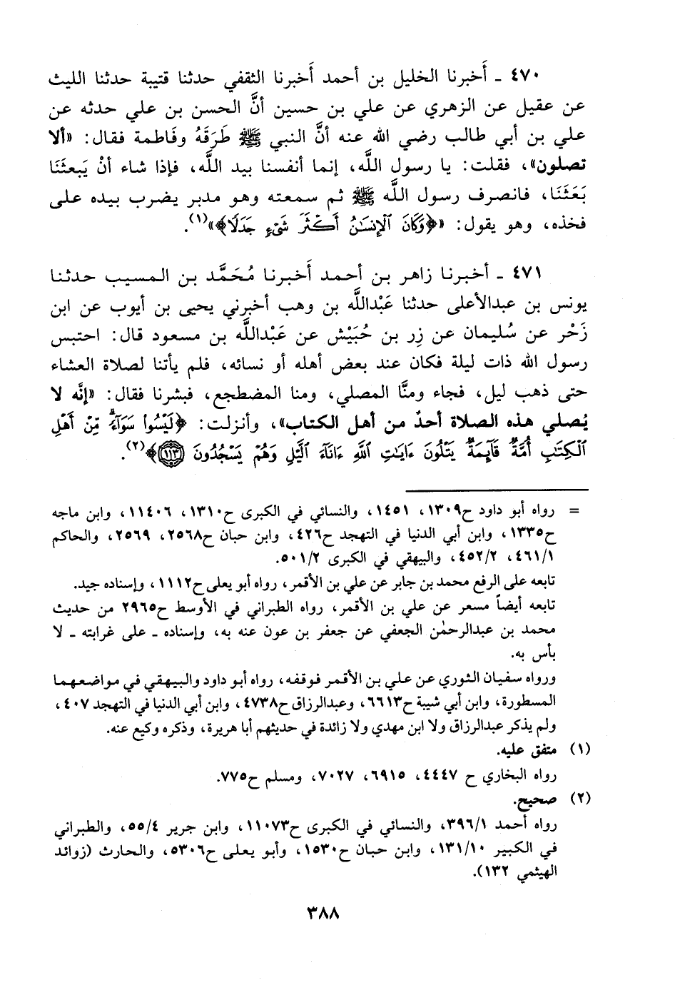 470- أخبرنا الخليل بن أحمد أخبرنا الثقفي حدثنا قتيبة حدثنا الليث عن عقيل عن الزهري عن علي بن حسين أن الحسن بن علي حدثه عن علي بن أبي طالب رضي الله عنه أن النبي صلى الله عليه وسلم طرقه وفاطمة فقال: ألا تصلون فقلت: يا رسول الله إنما أنفسنا بيد الله فإذا شاء أن يبعثنا بعثنا فانصرف رسول الله صلى الله عليه وسلم ثم سمعته وهو مدبر يضرب بيده على فخذه وهو يقول: {وكان الإنسان أكثر شئ جدلا} .