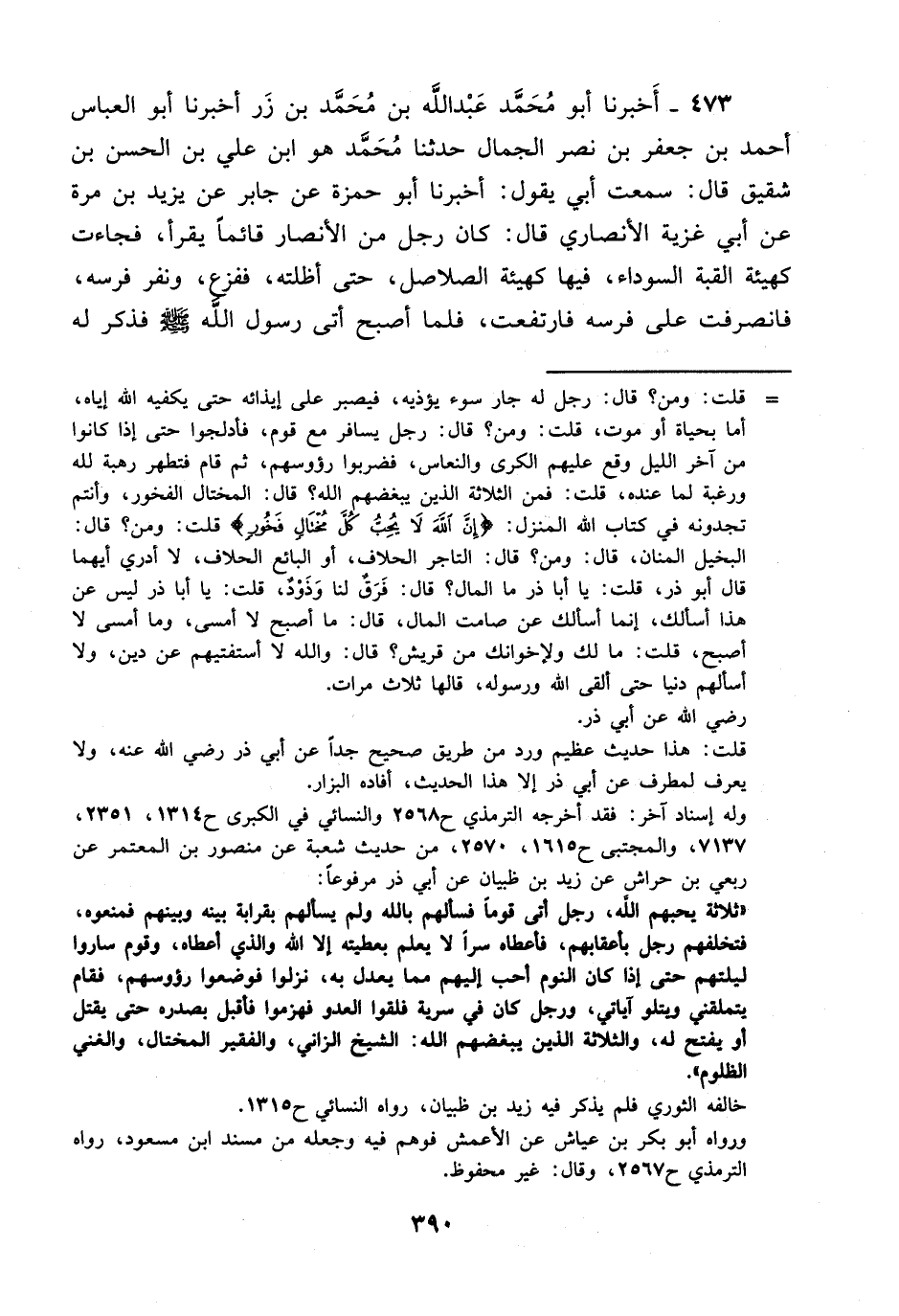 473- أخبرنا أبو محمد عبد الله بن محمد بن زر أخبرنا أبو العباس أحمد بن جعفر بن نصر الجمال حدثنا محمد هو ابن علي بن الحسن بن شقيق قال: سمعت أبي يقول: أخبرنا أبو حمزة عن جابر عن يزيد بن مرة، عَن أبي غزية الأنصاري قال: كان رجل من الأنصار قائما يقرأ فجاءت كهيئة القبة السوداء فيها كهيئة الصلاصل حتى أظلته ففزع ونفر فرسه فانصرفت على فرسه فارتفعت فلما أصبح أتى رسول الله صلى الله عليه وسلم فذكر له -[391]- ذلك فقال له رسول الله صلى الله عليه وسلم: تلك السكينة أذنت القرآن حين سمعته أما إنك لو ثبت رأيت منها عجبا.