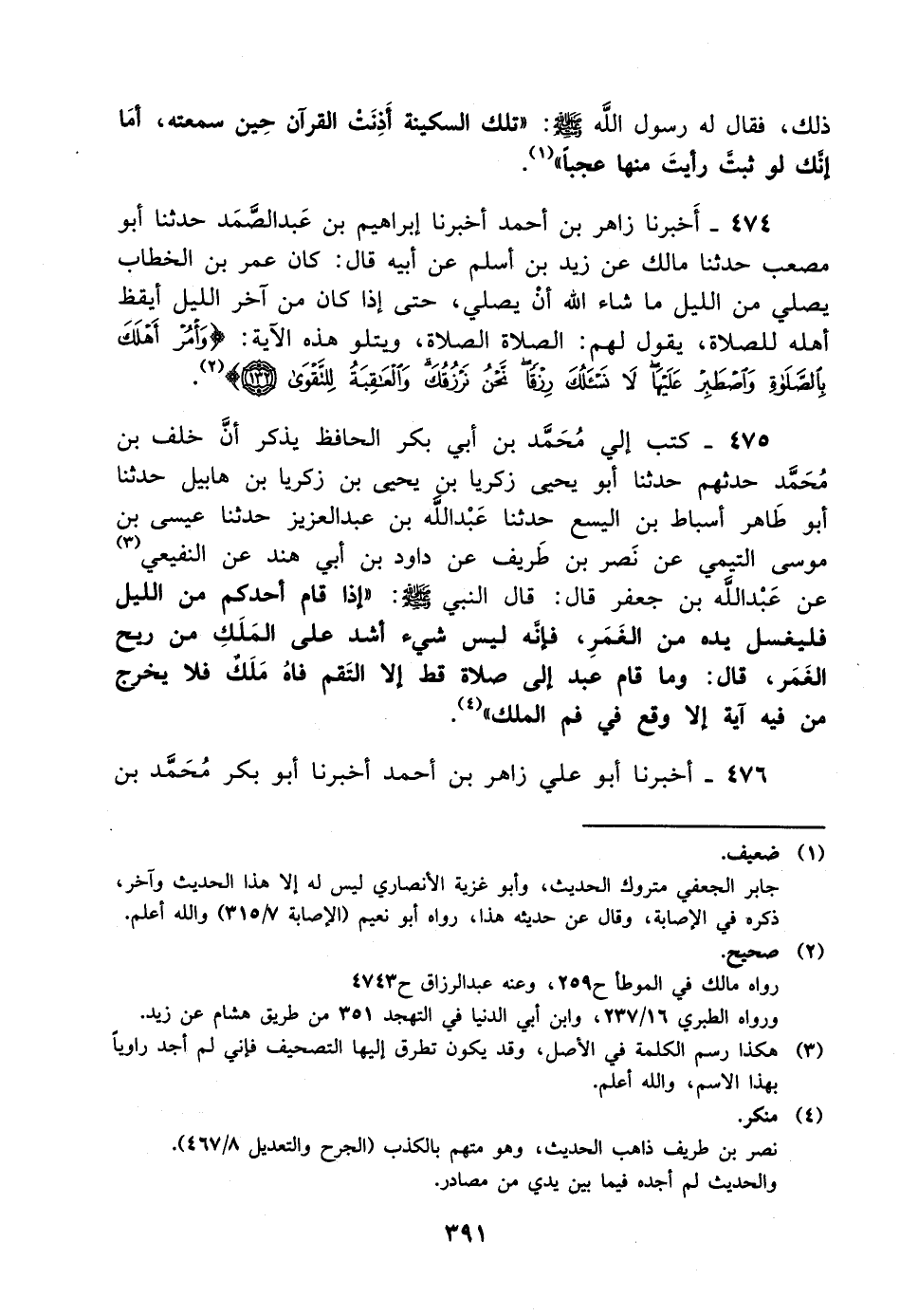 474- أخبرنا زاهر بن أحمد أخبرنا إبراهيم بن عبد الصمد حدثنا أبومصعب حدثنا مالك عن زيد بن أسلم عن أبيه قال: كان عمر بن الخطاب يصلي من الليل ما شاء الله أن يصلي حتى إذا كان من آخر الليل أيقظ أهله للصلاة يقول لهم: الصلاة الصلاة ويتلو هذه الآية {وأمر أهلك بالصلوة واصطبر عليها لا نسئلك رزقا نحن نرزقك والعاقبة للتقوى} .