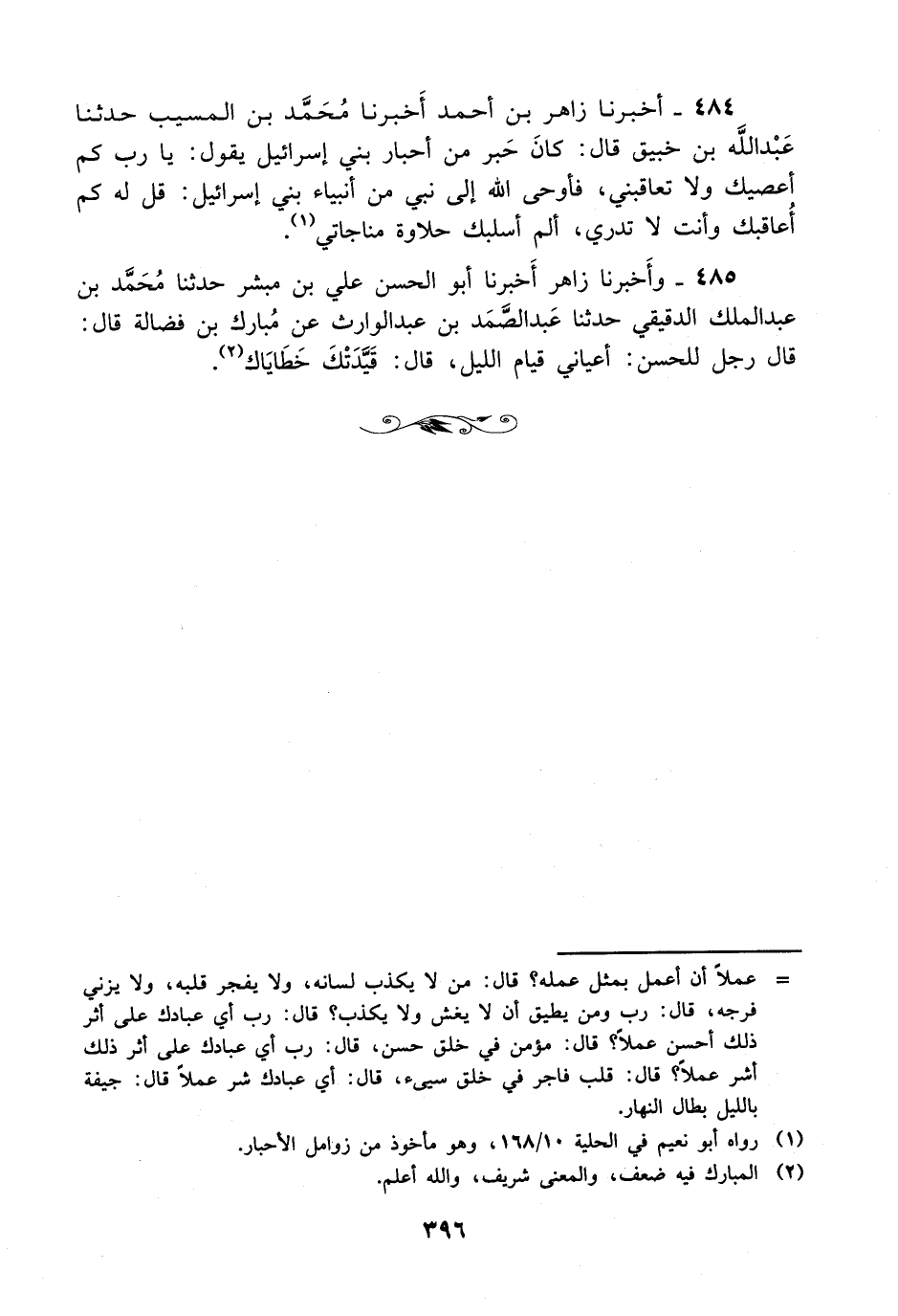 484- أخبرنا زاهر بن أحمد أخبرنا محمد بن المسيب حدثنا عبد الله بن خبيق قال: كان حبر من أحبار بني إسرائيل يقول: يارب كم أعصيك، ولاَ تعاقبني فأوحى الله إلى نبي من أنبياء بني إسرائيل: قل له كم أعاقبك وأنت لا تدري ألم أسلبك حلاوة مناجاتي.