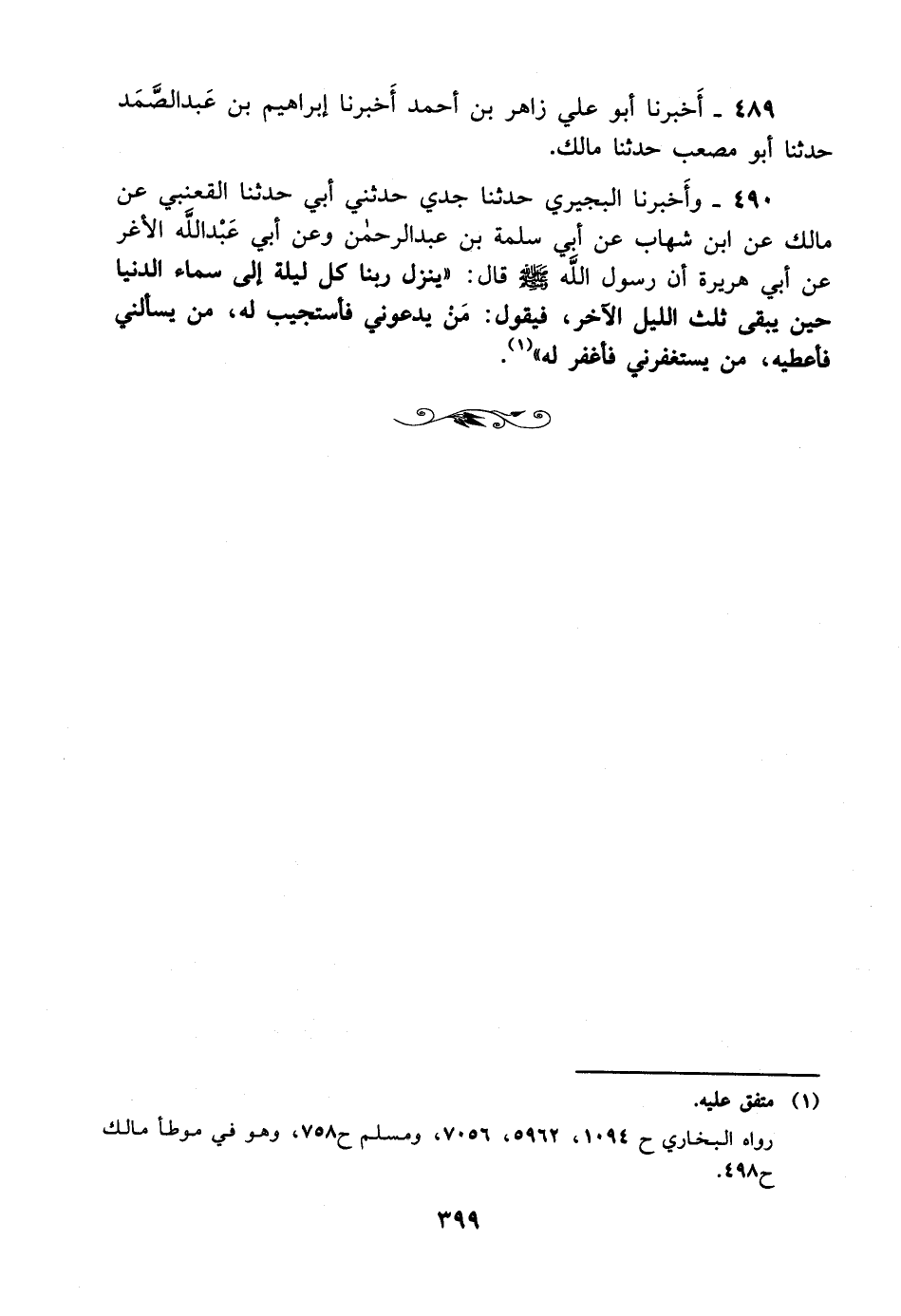 490- وأخبرنا البجيري حدثنا جدي حدثني أبي حدثنا القعنبي عن مالك عن ابن شهاب، عَن أبي سلمة بن عبد الرحمن وعن أبي عبد الله الأغر، عَن أبي هريرة أن رسول الله صلى الله عليه وسلم قال: ينزل ربنا كل ليلة إلى سماء الدنيا حين يبقى ثلث الليل الآخر فيقول: من يدعوني فأستجيب له من يسألني فأعطيه من يستغفرني فأغفر له.