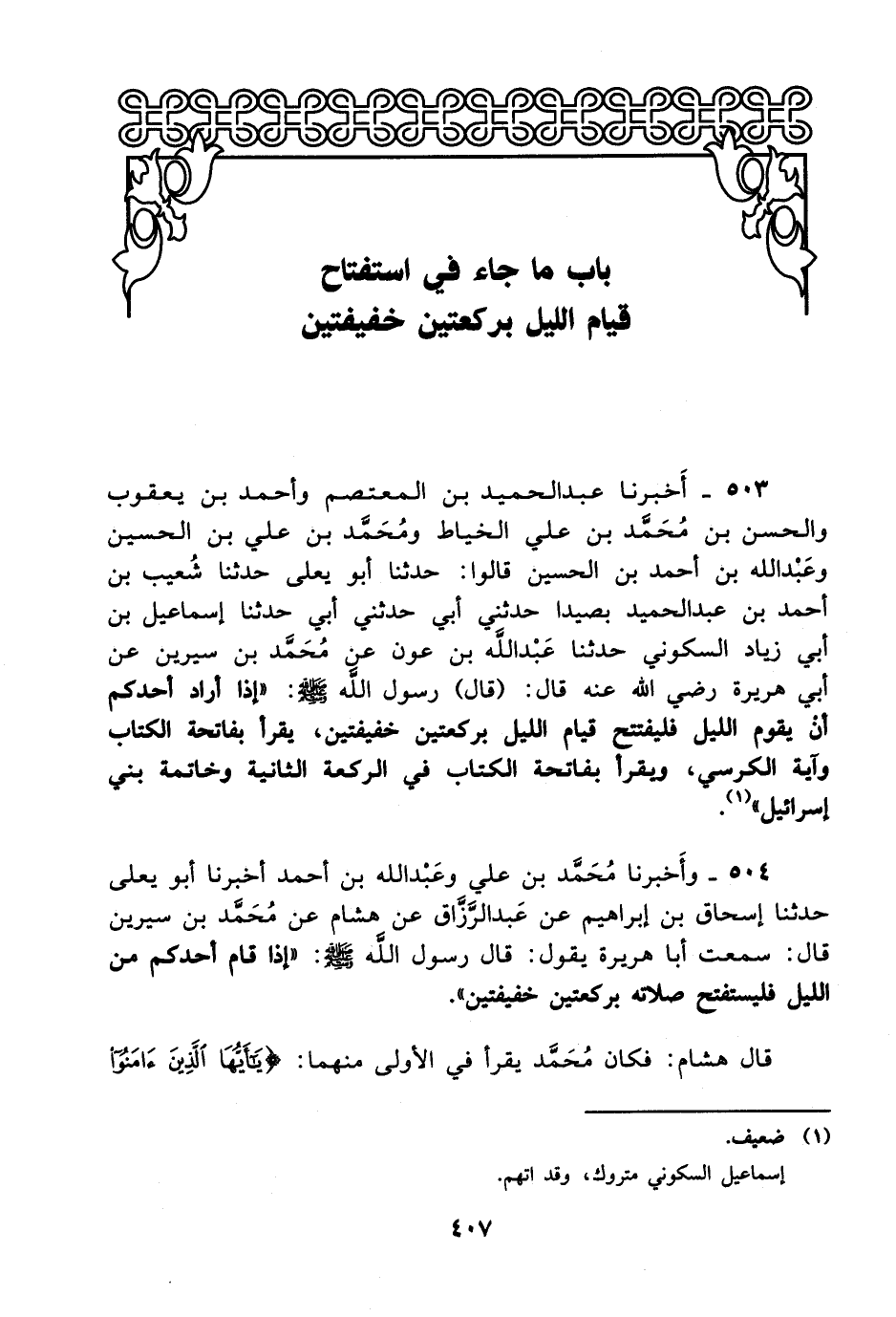 503- أخبرنا عبد الحميد بن المعتصم وأحمد بن يعقوب والحسن بن محمد بن علي الخياط ومحمد بن علي بن الحسين وعبد الله بن أحمد بن الحسين قالوا: حدثنا أبو يعلى حدثنا شعيب بن أحمد بن عبد الحميد بصيدا حدثني أبي حدثني أبي حدثنا إسماعيل بن أبي زياد السكوني حدثنا عبد الله بن عون عن محمد بن سيرين، عَن أبي هريرة رضي الله عنه قال: قال رسول الله صلى الله عليه وسلم: إذا أراد أحدكم أن يقوم الليل فليفتتح قيام الليل بركعتين خفيفتين يقرأ بفاتحة الكتاب وآية الكرسي ويقرأ بفاتحة الكتاب في الركعة الثانية وخاتمة بني إسرائيل.