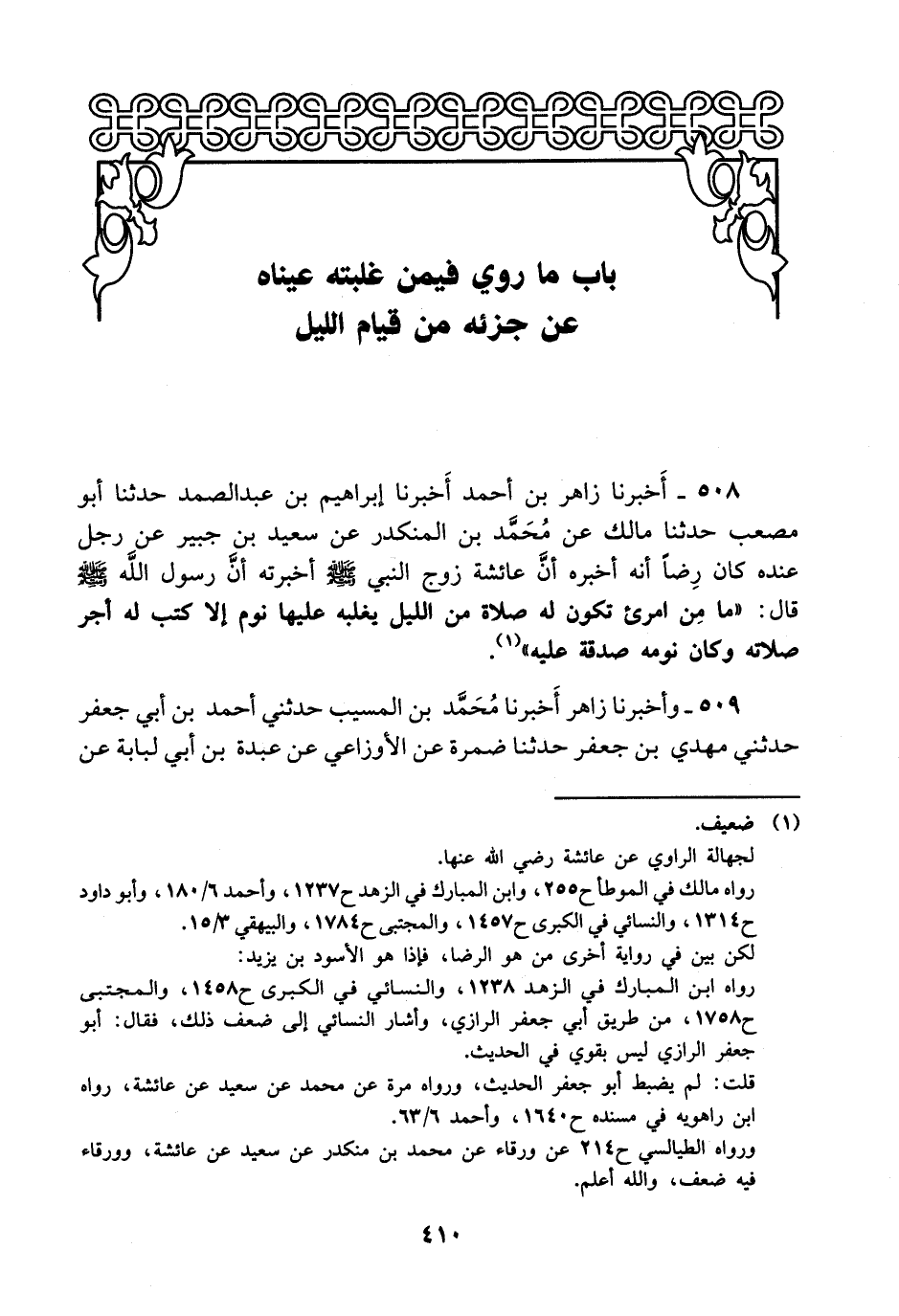 508- أخبرنا زاهر بن أحمد أخبرنا إبراهيم بن عبد الصمد حدثنا أبو مصعب حدثنا مالك عن محمد بن المنكدر عن سعيد بن جبير عن رجل عنده كان رضا أنه أخبره أن عائشة زوج النبي صلى الله عليه وسلم أخبرته أن رسول الله صلى الله عليه وسلم قال: ما من امرئ تكون له صلاة من الليل يغلبه عليها نوم إلا كتب له أجر صلاته وكان نومه صدقة عليه.