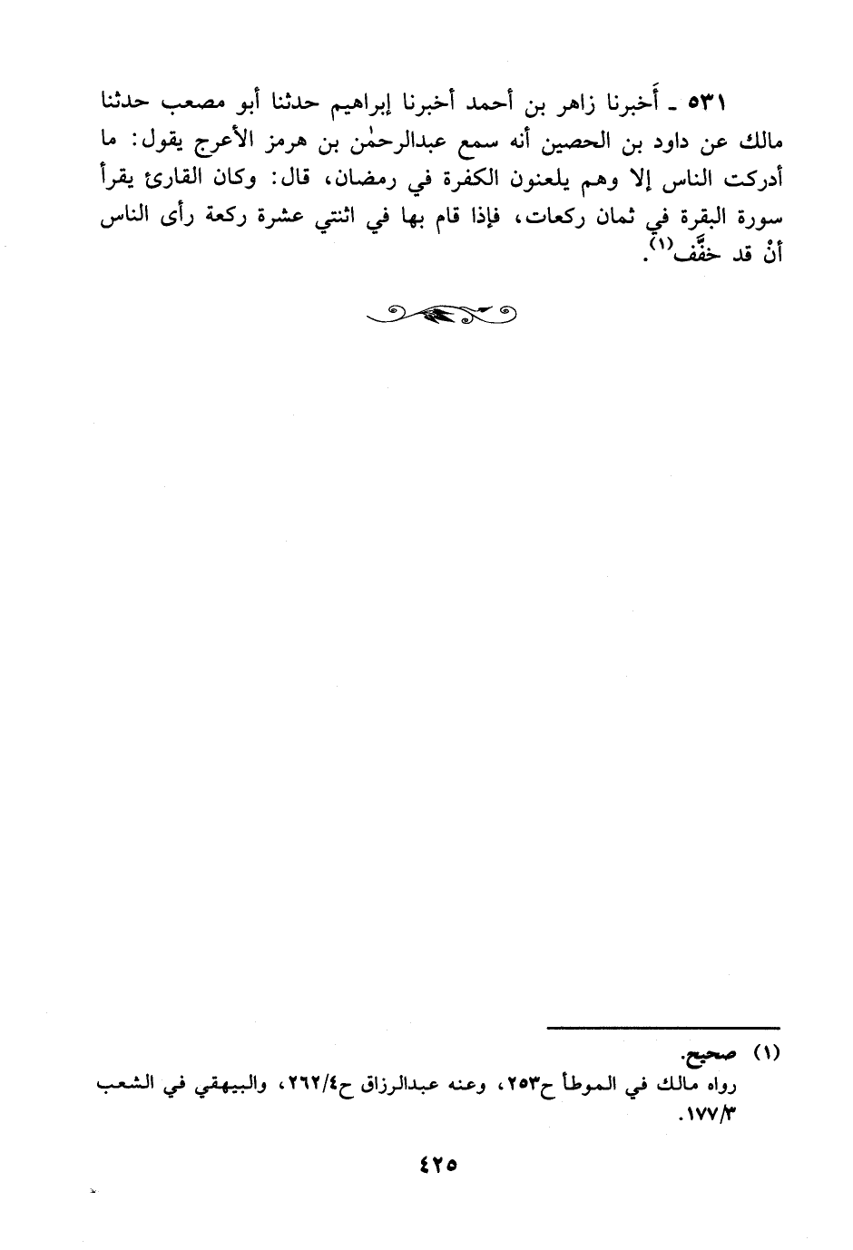 531- أخبرنا زاهر بن أحمد أخبرنا إبراهيم حدثنا أبو مصعب حدثنا مالك عن داود بن الحصين أنه سمع عبد الرحمن بن هرمز الأعرج يقول: ما أدركت الناس إلا وهم يلعنون الكفرة في رمضان قال: وكان القارئ يقرأ سورة البقرة في ثمان ركعات فإذا قام بها في اثنتي عشرة ركعة رأى الناس أن قد خفف.