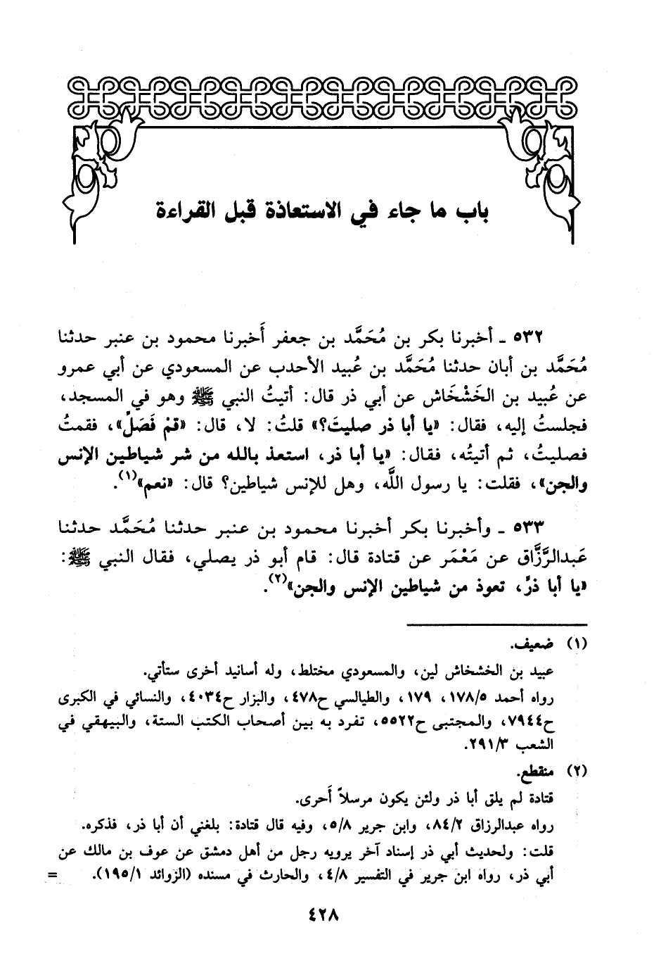 533- وأخبرنا بكر أخبرنا محمود بن عنبر حدثنا محمد حدثنا عبد الرزاق عن معمر عن قتادة قال: قام أبو ذر يصلي فقال النبي صلى الله عليه وسلم: يا أبا ذر تعوذ من شياطين الإنس والجن.