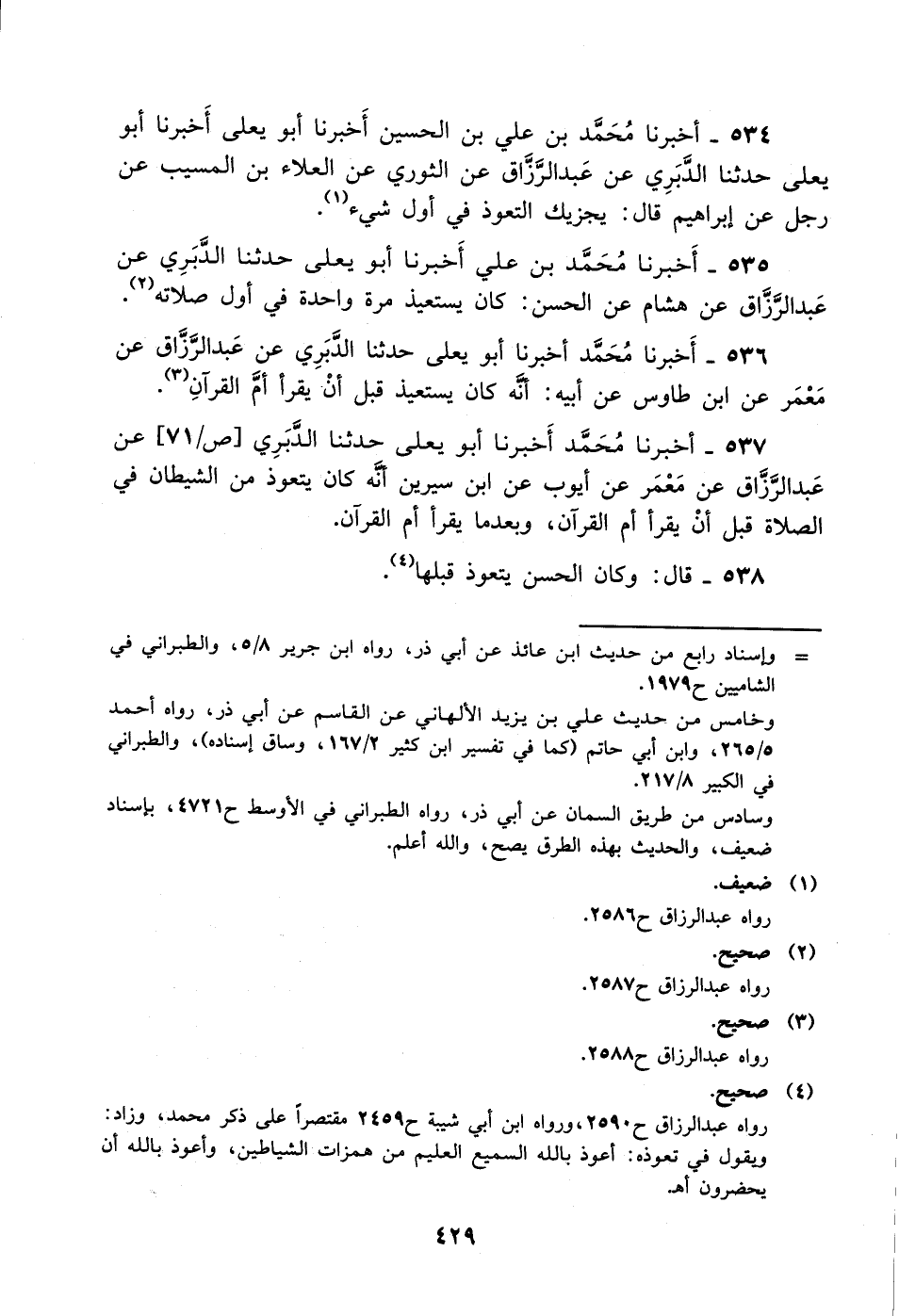 537- أخبرنا محمد أخبرنا أبو يعلى حدثنا الدبري، عَن عَبد الرزاق عن معمر عن أيوب عن ابن سيرين أنه كان يتعوذ من الشيطان في الصلاة قبل أن يقرأ أم القرآن وبعدما يقرأ أم القرآن.