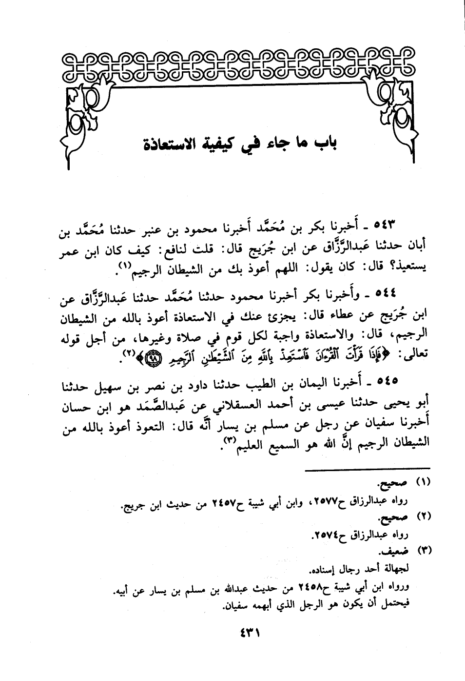 543- أخبرنا بكر بن محمد أخبرنا محمود بن عنبر حدثنا محمد بن أبان حدثنا عبد الرزاق عن ابن جريج قال: قلت لنافع: كيف كان ابن عمر يستعيذ؟ قال: كان يقول: اللهم أعوذ بك من الشيطان الرجيم.