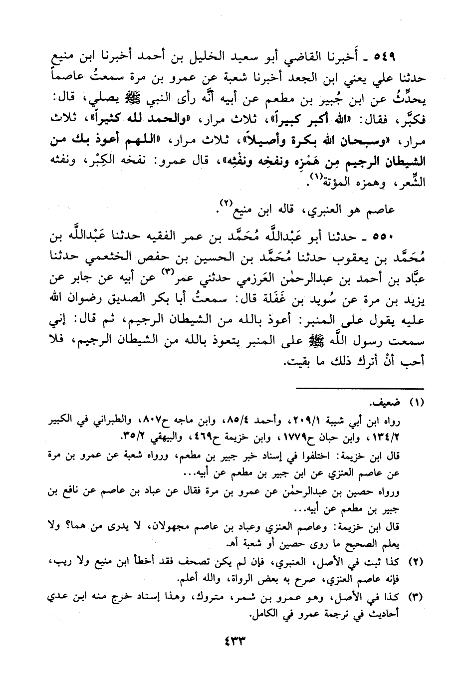 549- أخبرنا القاضي أبو سعيد الخليل بن أحمد أخبرنا ابن منيع حدثنا علي يعني ابن الجعد أخبرنا شعبة عن عمرو بن مرة سمعت عاصما يحدث عن ابن جبير بن مطعم عن أبيه أنه رأى النبي صلى الله عليه وسلم يصلي قال: فكبر فقال: الله أكبر كبيرا ثلاث مرار والحمد لله كثيرا ثلاث مرار وسبحان الله بكرة وأصيلا ثلاث مرار اللهم أعوذ بك من الشيطان الرجيم من همزه ونفخه ونفثه قال عمرو: نفخه الكبر ونفثه الشعر وهمزه المؤتة.