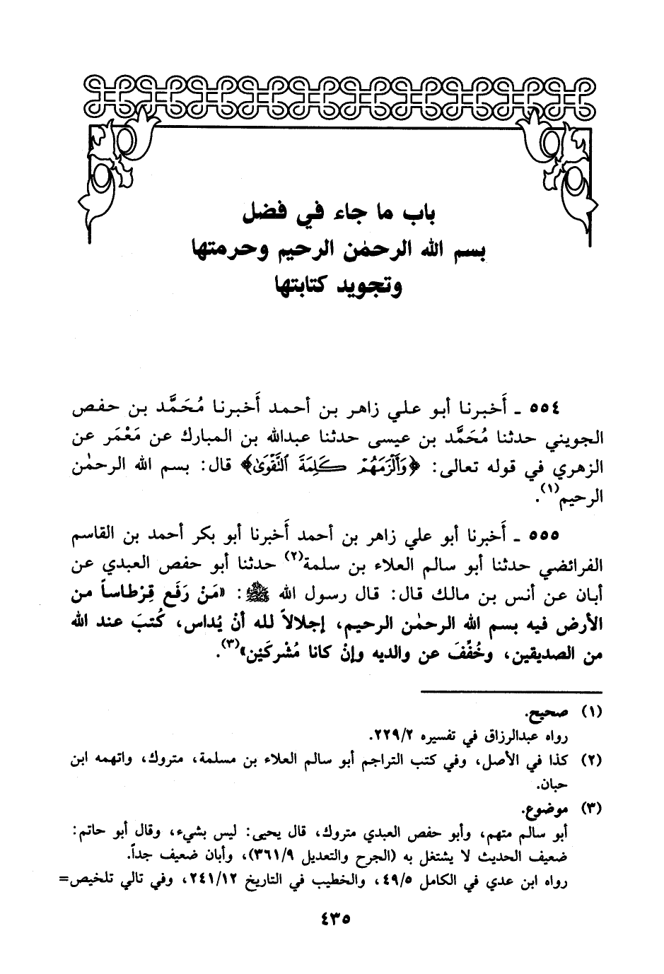 باب ما جاء في فضل بسم الله الرحمن الرحيم وحرمتها وتجويد كتابتها