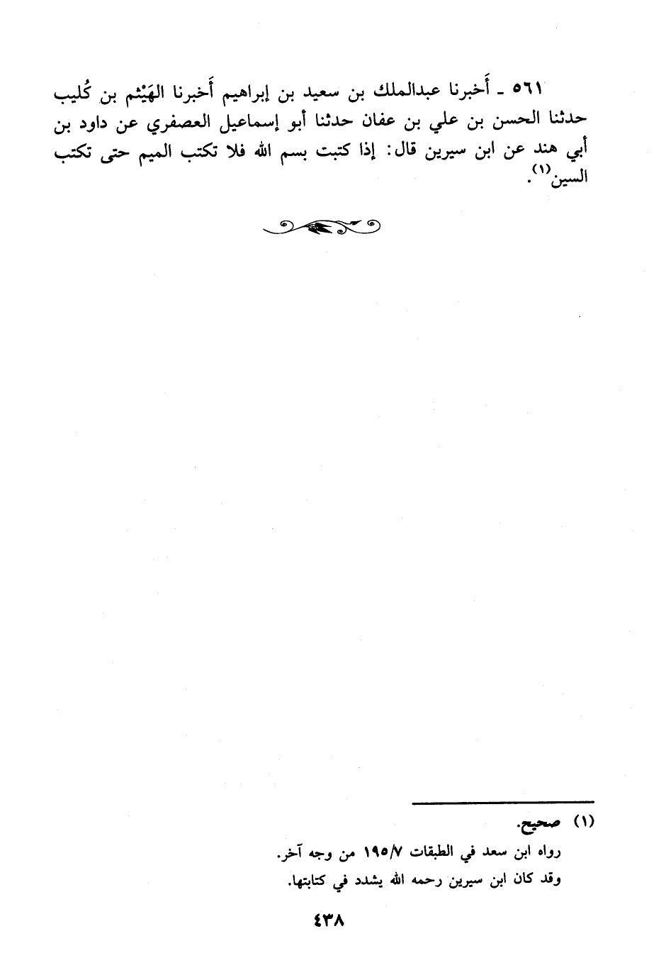 561- أخبرنا عبد الملك بن سعيد بن إبراهيم أخبرنا الهيثم بن كليب حدثنا الحسن بن علي بن عفان حدثنا أبو إسماعيل العصفري عن داود بن أبي هند عن ابن سيرين قال: إذا كتبت بسم الله فلا تكتب الميم حتى تكتب السين.
